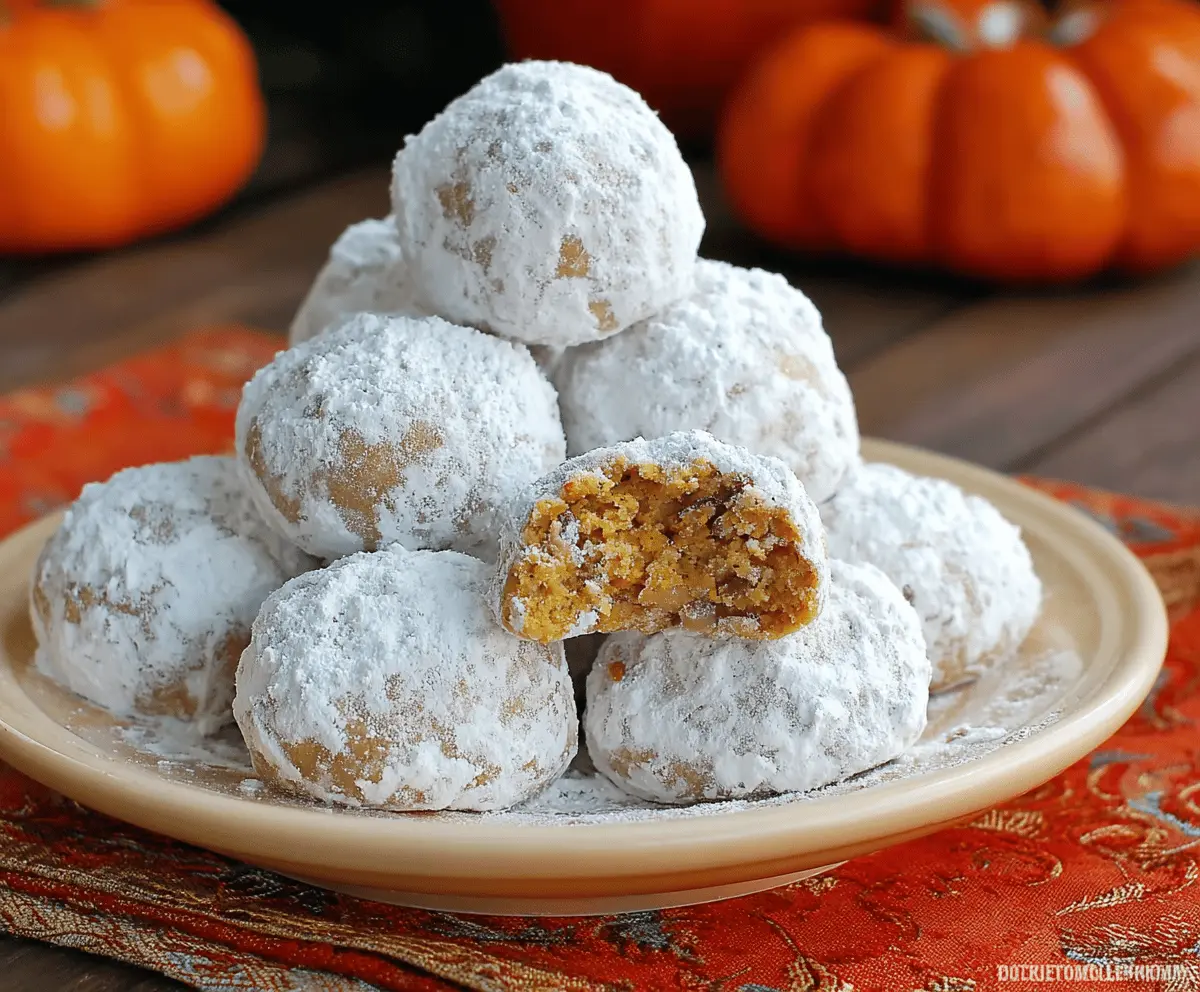 Enjoy a festive autumn treat with these moist, spiced pumpkin snowball cookies dusted generously in powdered sugar—perfect for gatherings or a cozy snack!
