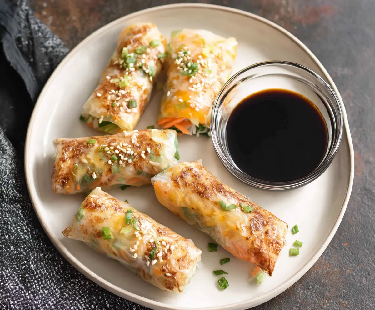 While the rolls are air frying, whisk together the dipping sauce ingredients in a small bowl. Combine the soy sauce, rice vinegar, honey (or sugar), sesame oil, minced garlic, chili flakes, and chopped green onions until well mixed.