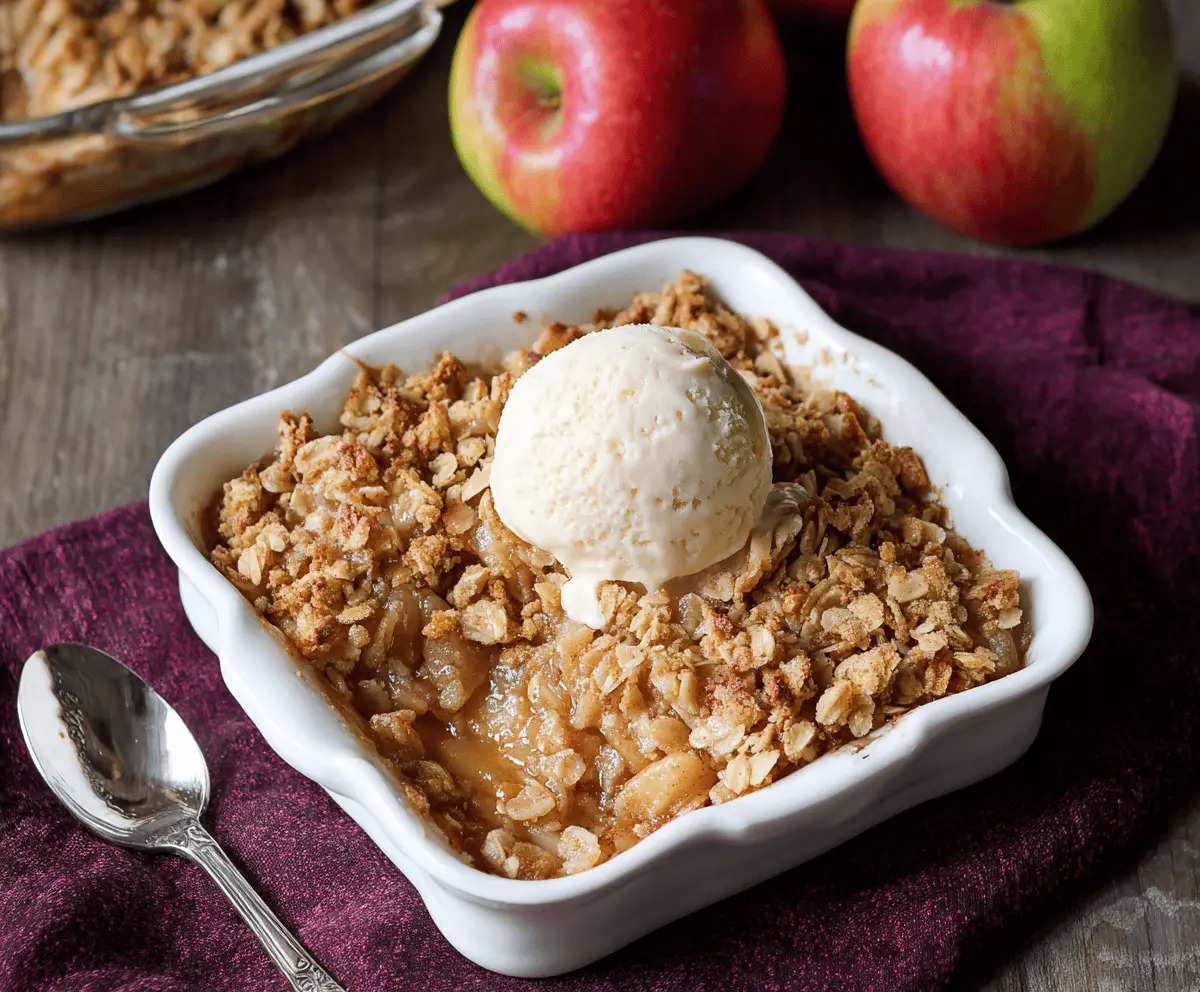 Allow the apple crisp to cool for just a few minutes before serving. It’s scrumptious on its own, but you can make it even more delightful with a scoop of vanilla ice cream or a dollop of whipped cream on top!
