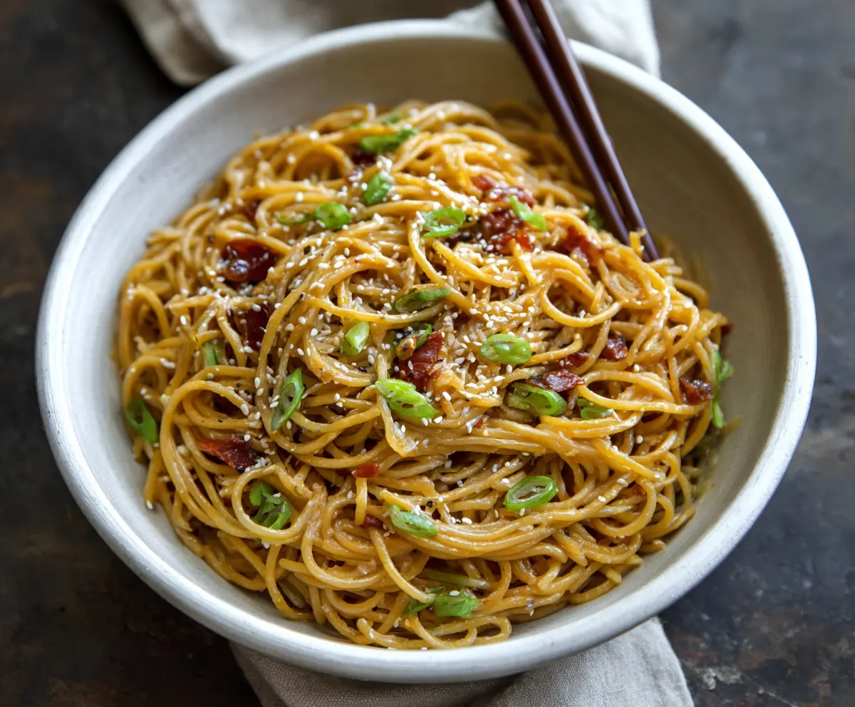 Once everything is combined thoroughly, remove the skillet from heat. Serve the noodles in bowls, topped with the reserved green onions and a sprinkle of toasted sesame seeds for added crunch and flavor. Enjoy your warm and tasty Asian Garlic Noodles!