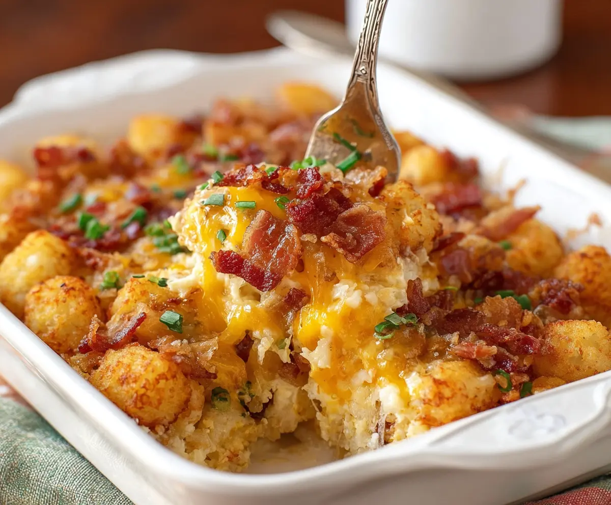 This casserole is sure to please with its crispy tots, savory bacon, fluffy eggs, and a layer of gooey, melted cheese in every bite. Perfect for a family breakfast or brunch gathering!