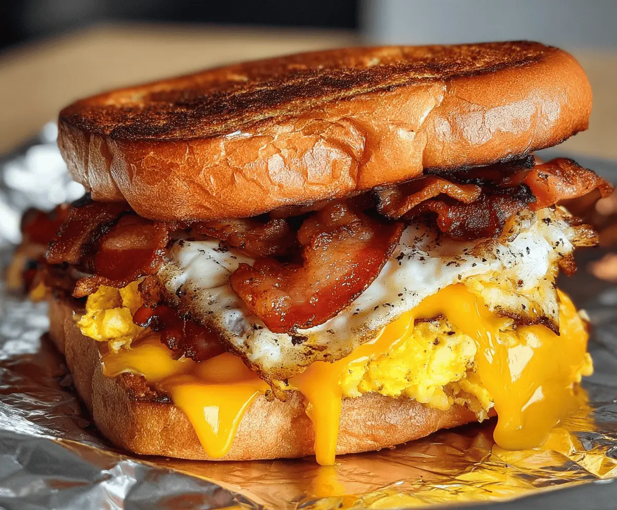 Your warm, melty Bacon Egg Breakfast Sandwich is ready! Serve it immediately and savor the deliciousness, especially that glorious runny yolk. Breakfast perfection in every bite!