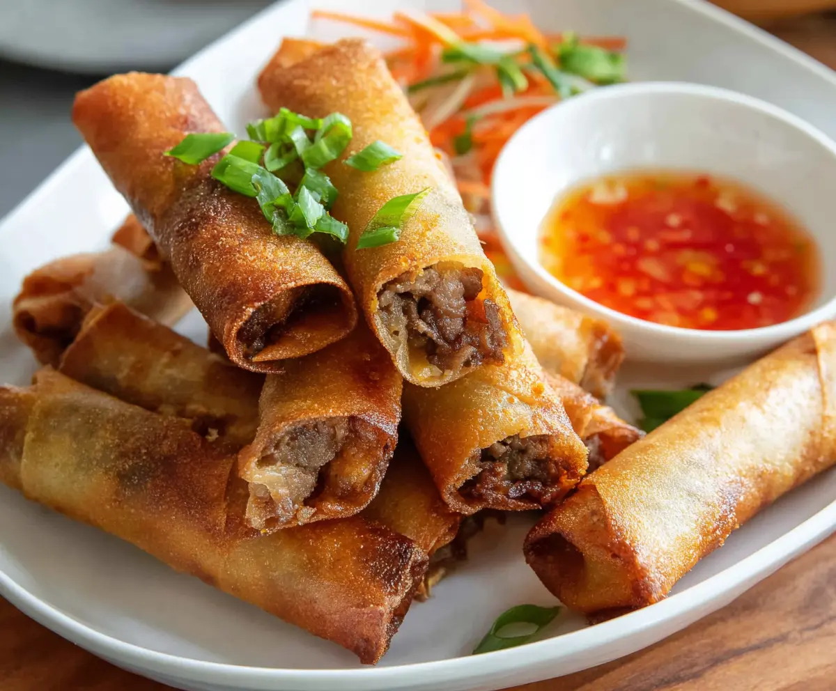Golden crispy beef lumpia with savory filling, perfect as Filipino snack or appetizer.