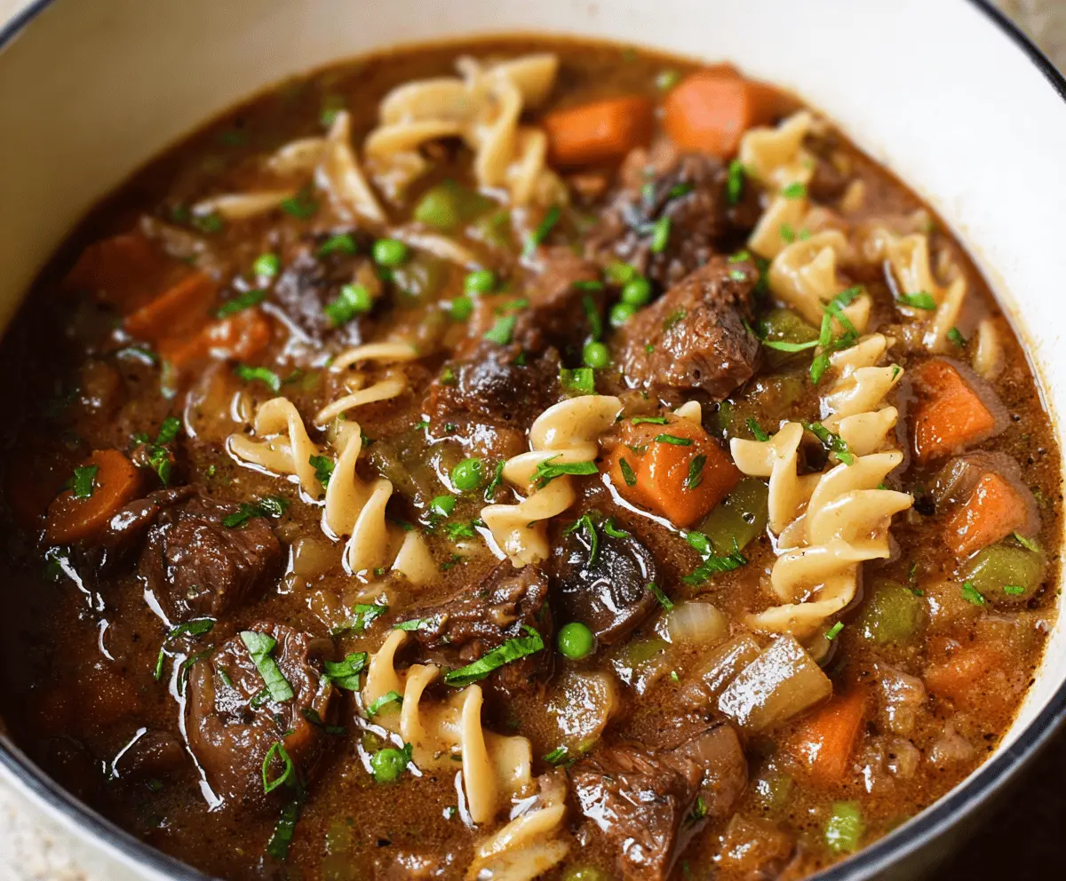 This recipe yields a rich, savory beef stew with tender chunks of meat, vibrant carrots and peas, and perfectly cooked noodles nestled in a flavorful broth. Dive in and savor every bite!