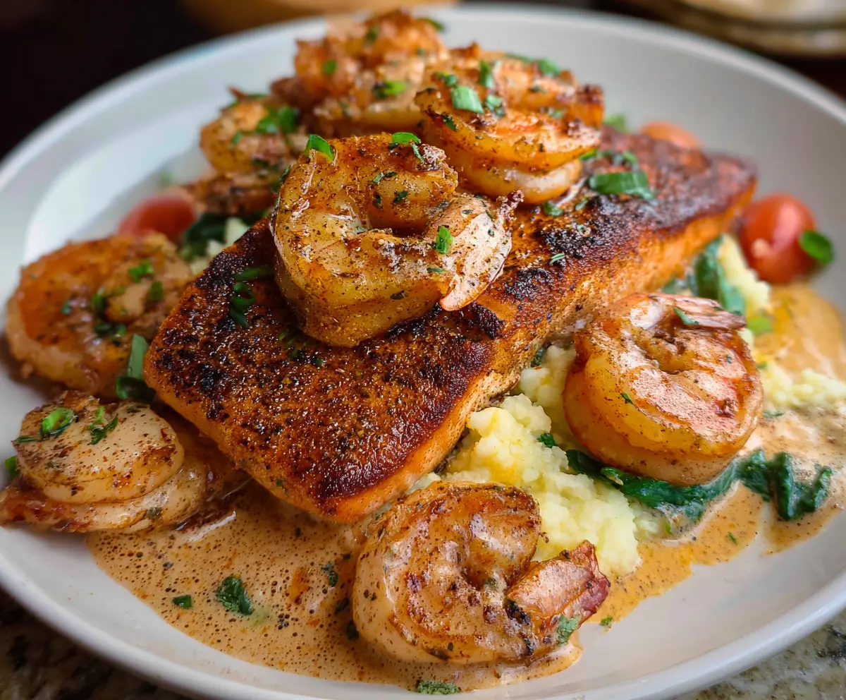 Delicious Cajun Salmon and Shrimp dish with vibrant spices and fresh ingredients.