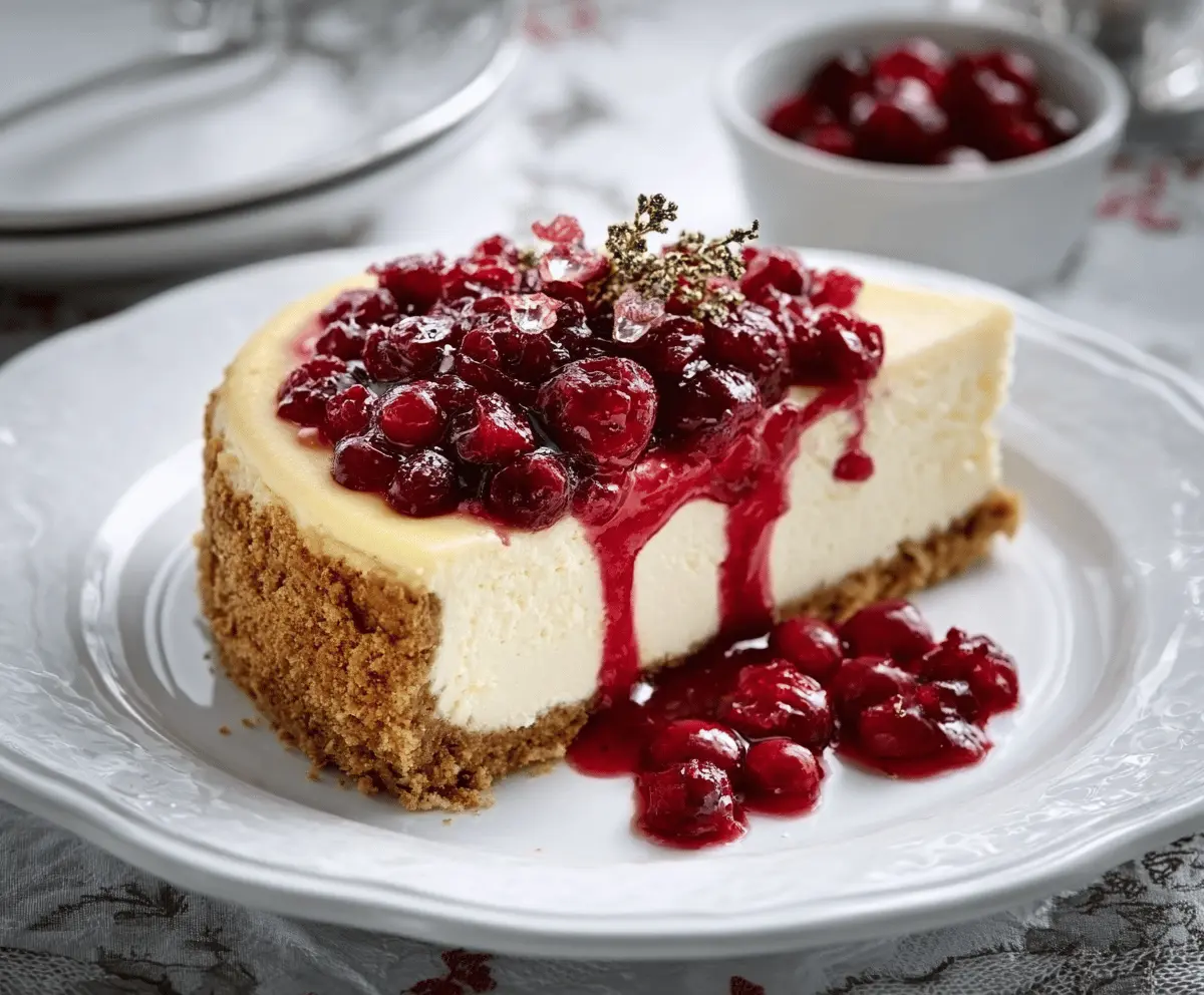 When your cheesecake is fully chilled, take it out of the fridge and spoon the cranberry topping generously over the top. If desired, you can garnish with a few fresh cranberries and some mint leaves for a pop of color. Cut into slices and enjoy your delicious, rich cheesecake with that tangy cranberry topping!
