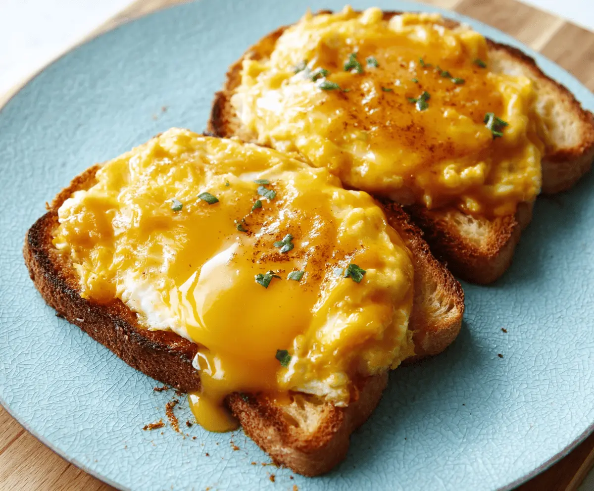 Remove the skillet from the heat and use a spoon to divide the cheesy scrambled eggs evenly over the toasted slices of bread. Make sure each slice gets a generous portion of those delicious eggs!