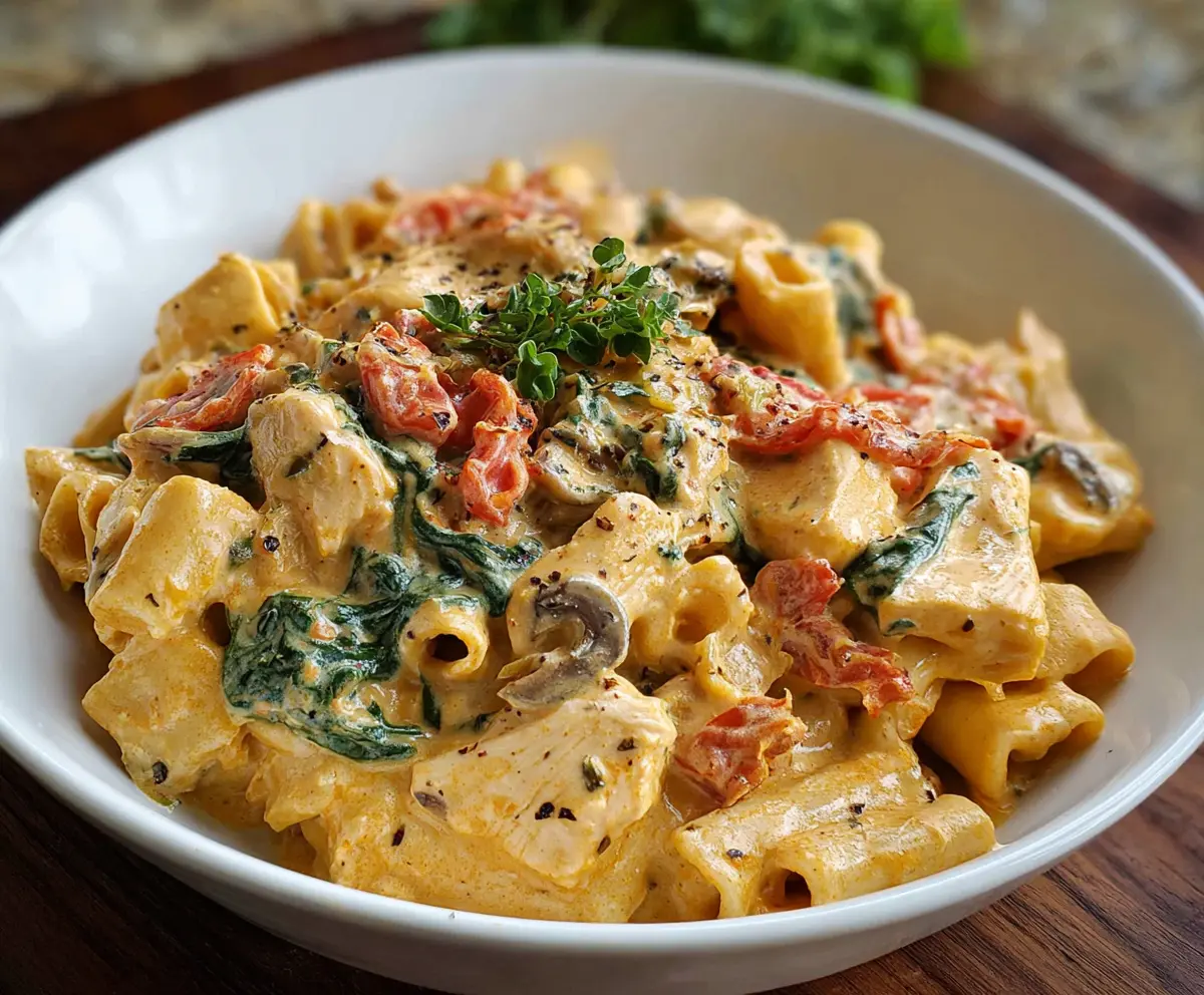 Creamy Tuscan Chicken Pasta dish featuring tender chicken, spinach, sun-dried tomatoes, and a rich cream sauce.