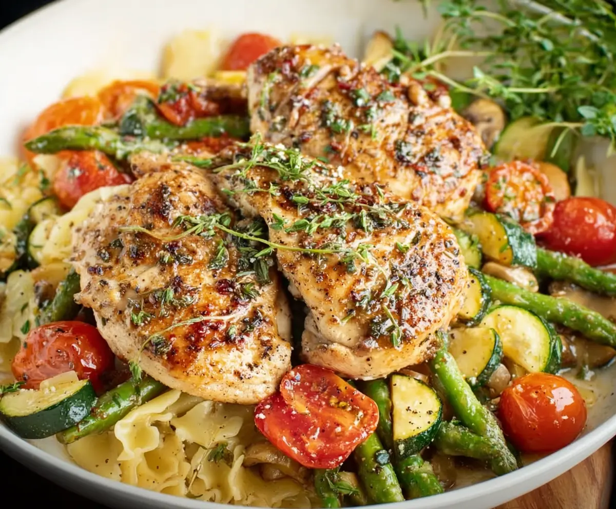 Fresh Chicken Primavera pasta dish with colorful vegetables and herbs