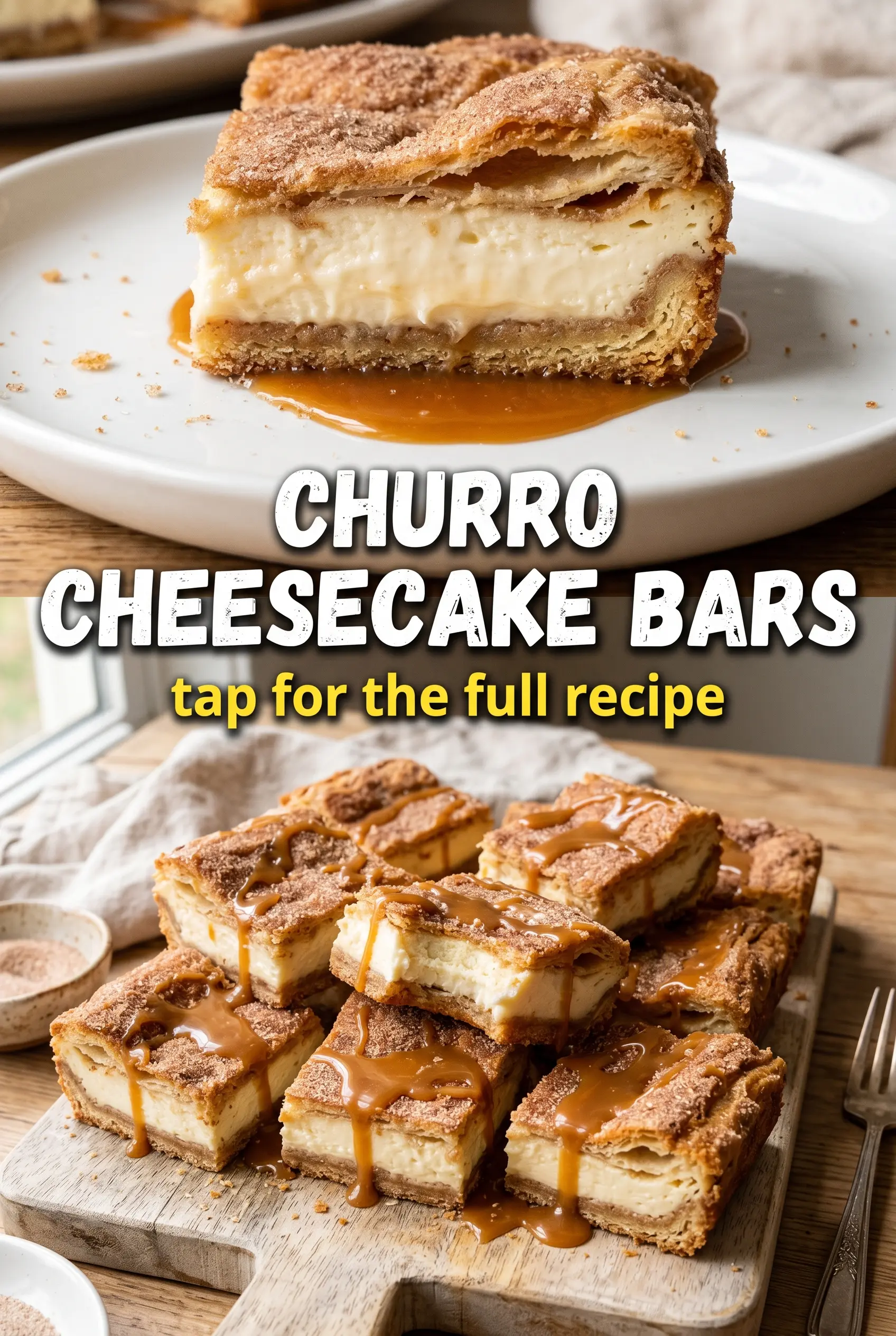Churro cheesecake bars bring two desserts together in the kind of way that makes the pan disappear fast: a crisp, cinnamon-heavy crust on the bottom, a dense and creamy cheesecake layer in the middle, and a buttery sugar topping that tastes like the outside of a fresh churro. The best part is how the layers stay distinct when the bars are chilled and cut cleanly, so every square gives you that crackly top and smooth filling in the same bite.