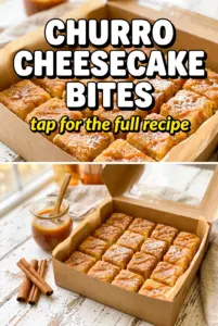 Below you’ll find the little details that matter most: how to keep the cheesecake layer from overbaking, what the churro pieces do in the filling, and the easiest way to get that cinnamon-sugar finish on top without making a sticky mess.