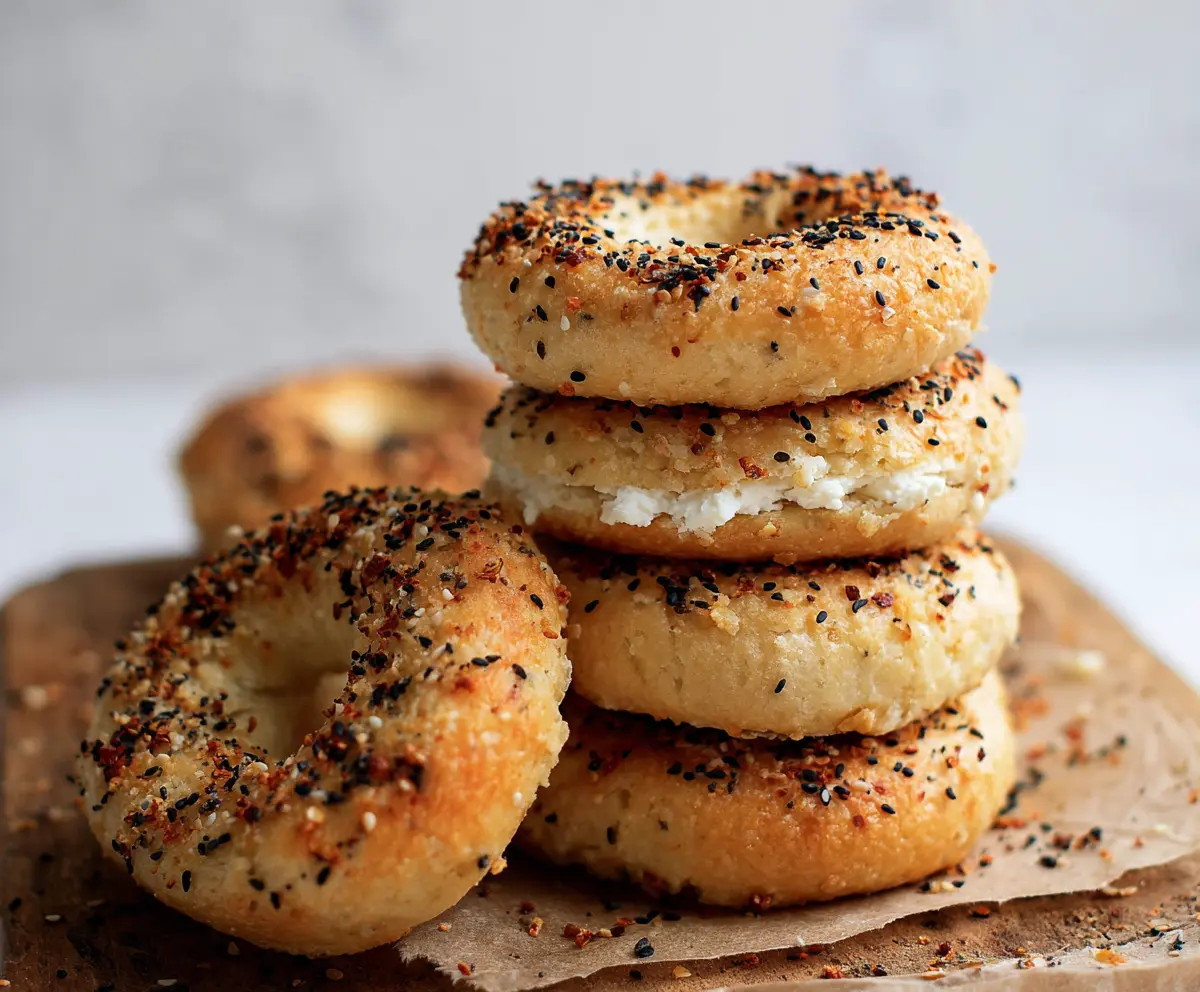 Sprinkle everything bagel seasoning generously over each bagel—this is where the flavor really shines! Then, pop them into the preheated oven and bake for 25-30 minutes, or until they are golden brown and cooked through.