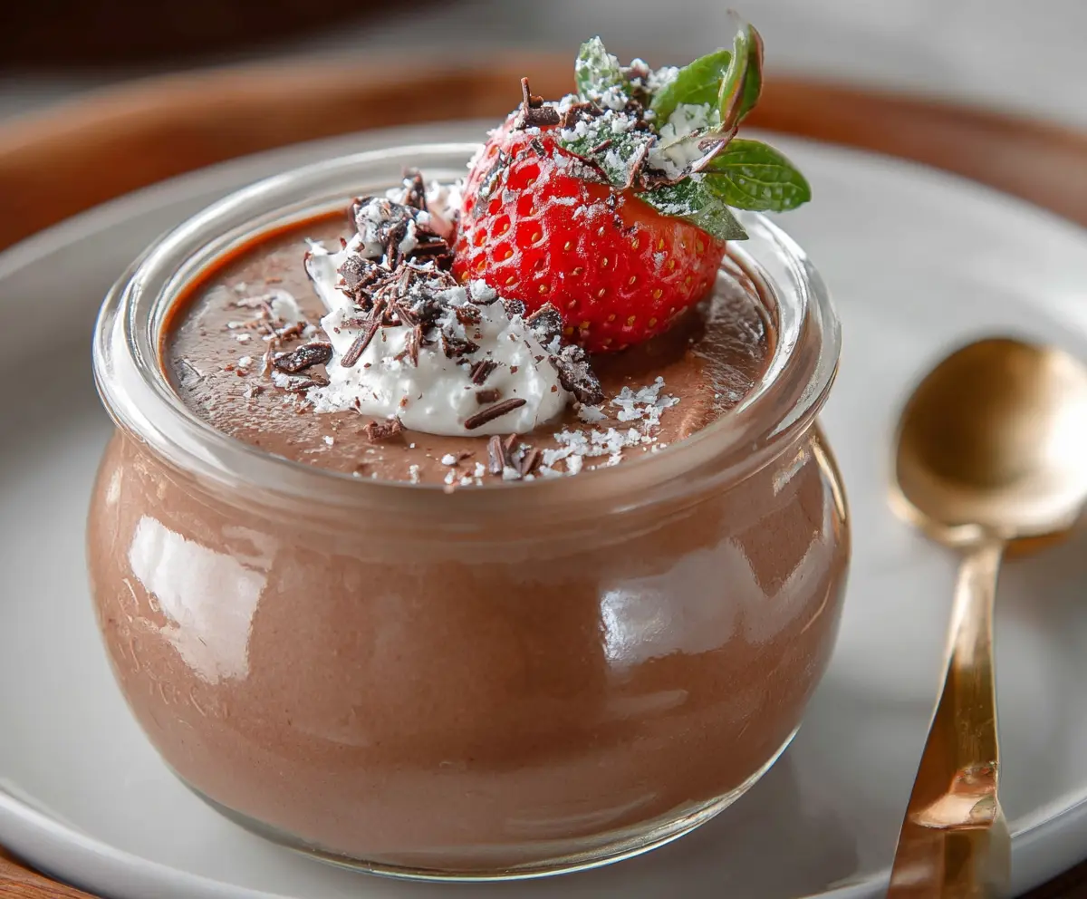 Creamy cottage cheese chocolate mousse served in a glass dish, garnished with cocoa powder and chocolate shavings.