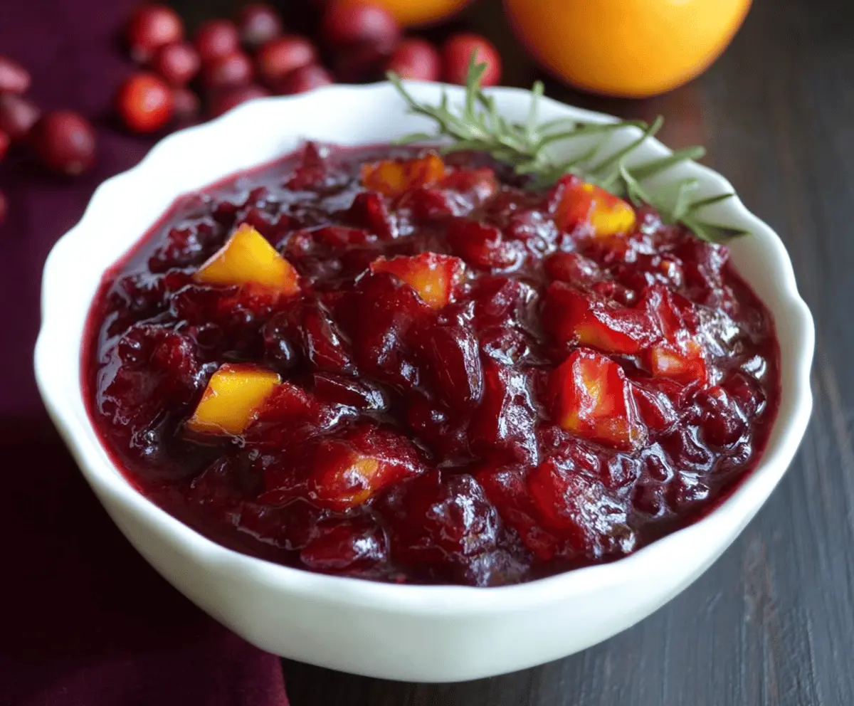 Delicious cranberry mango sauce served as a vibrant condiment for festive meals.
