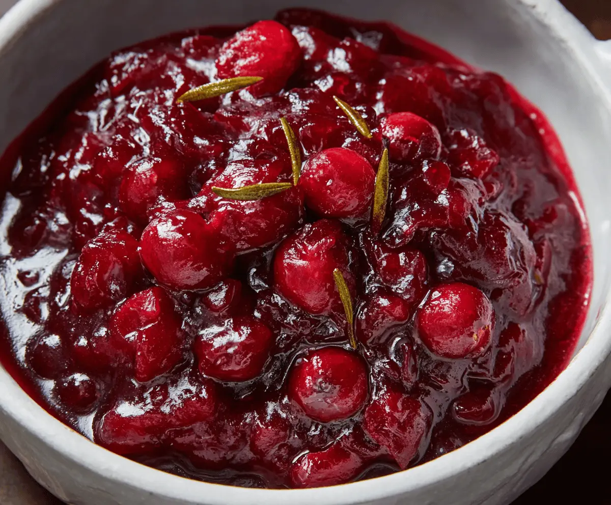 Delicious cranberry red wine sauce served in a glass bowl with fresh cranberries and a sprig of rosemary for a festive holiday meal.