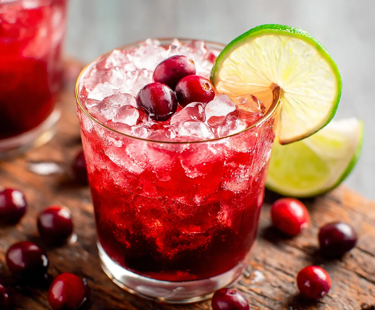 Refreshing cranberry vodka cocktail in a glass garnished with cranberries and a lime wedge.