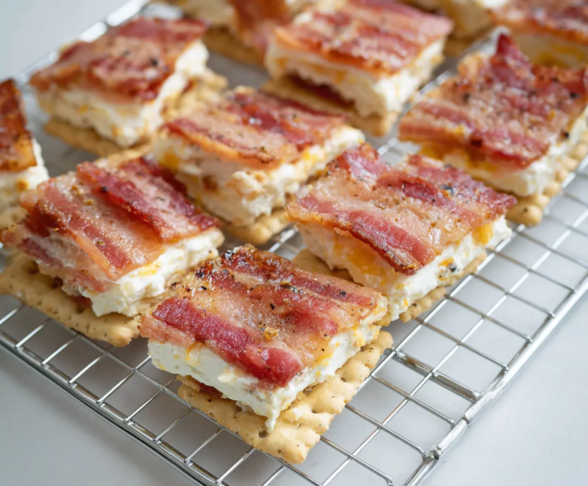 Cream Cheese Bacon Crackers on a serving platter, crispy with savory bacon and creamy cheese filling.