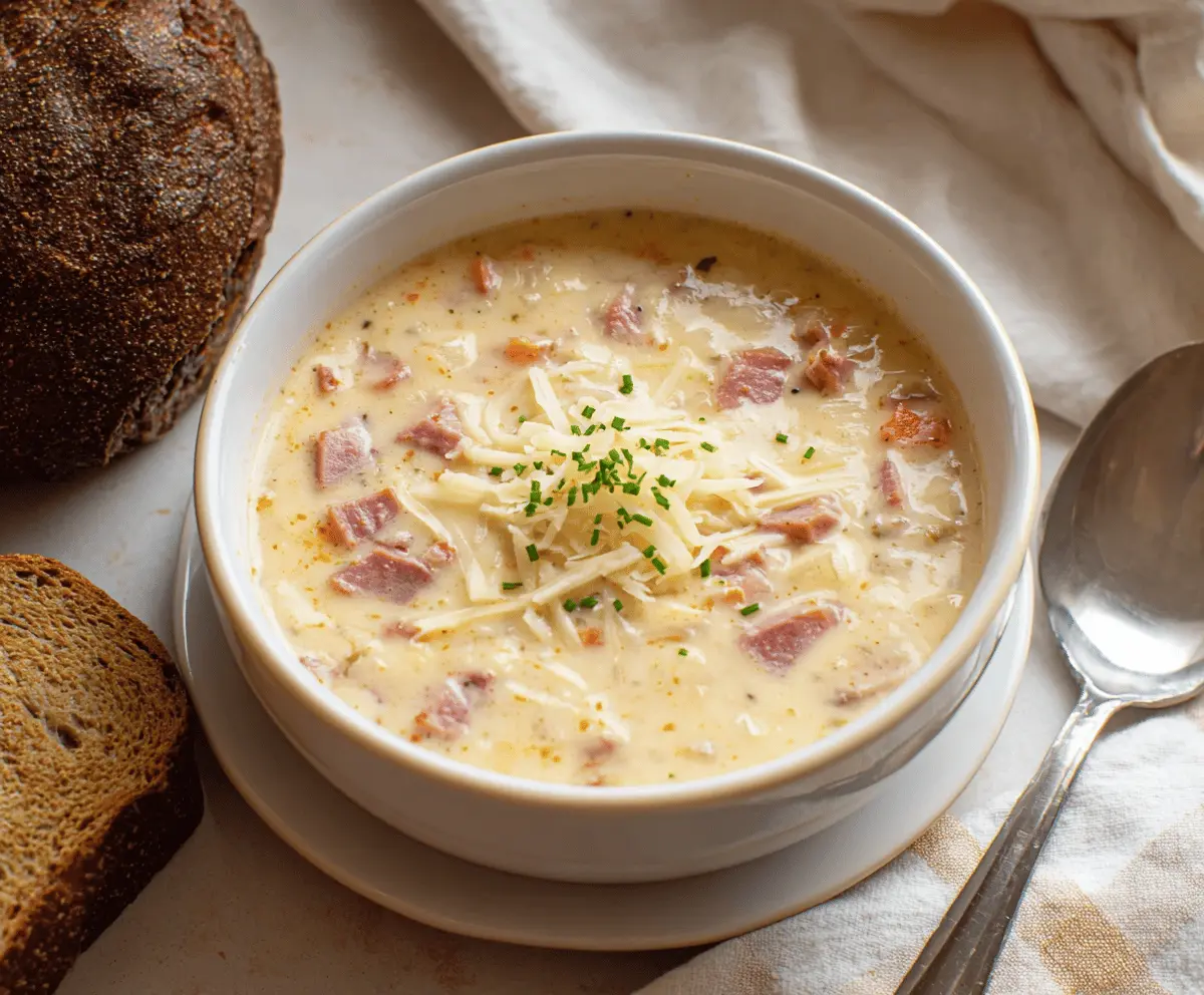 Finally, taste your soup and season it with salt and pepper according to your preference. Ladle it into bowls and top each with extra shredded Swiss cheese and a sprinkle of fresh chives or parsley. Don’t forget to serve with warm toasted rye bread on the side for the perfect dip!