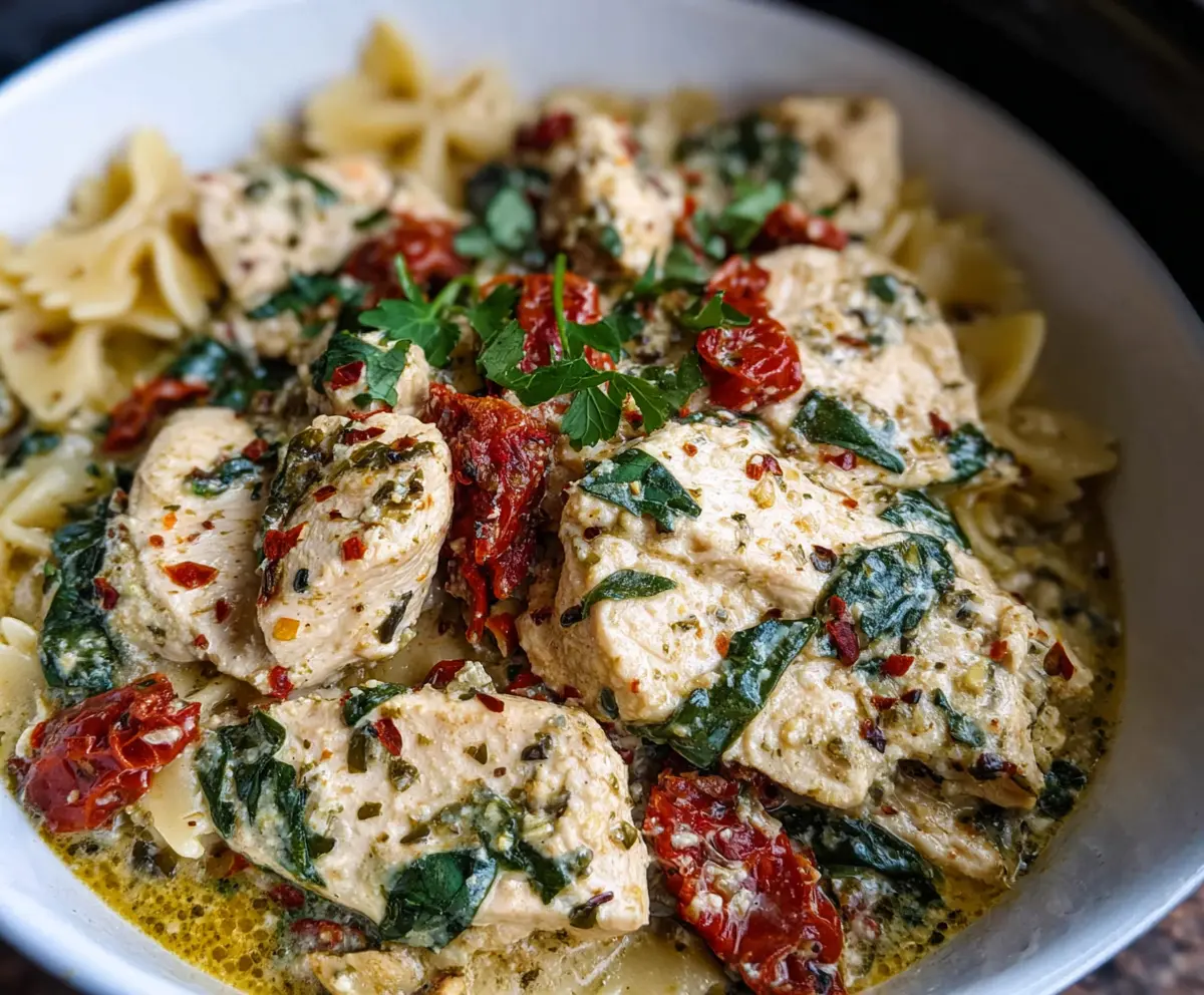 Creamy Crockpot Tuscan Chicken Pasta with sun-dried tomatoes and spinach in a rustic bowl.