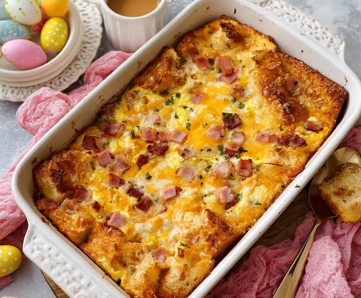 Slice the casserole into squares and serve warm. It goes wonderfully with a side of fresh fruit, orange juice, and coffee for a festive Easter morning!