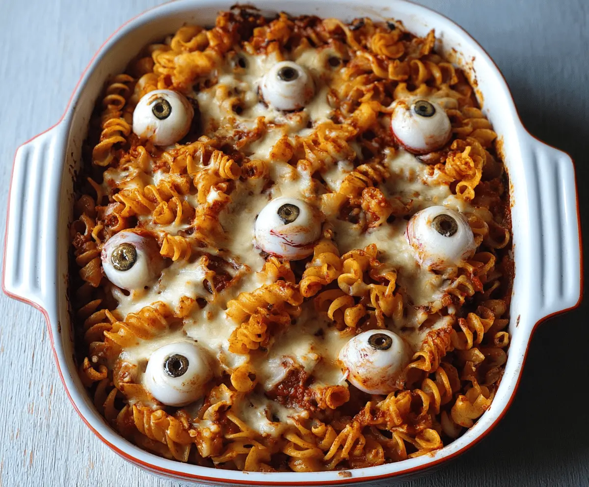 Once it’s ready, remove the dish from the oven. Garnish with chopped fresh parsley or basil for a pop of color. Let it cool slightly before serving. Enjoy your spooky and delicious Eyeball Pasta Bake!