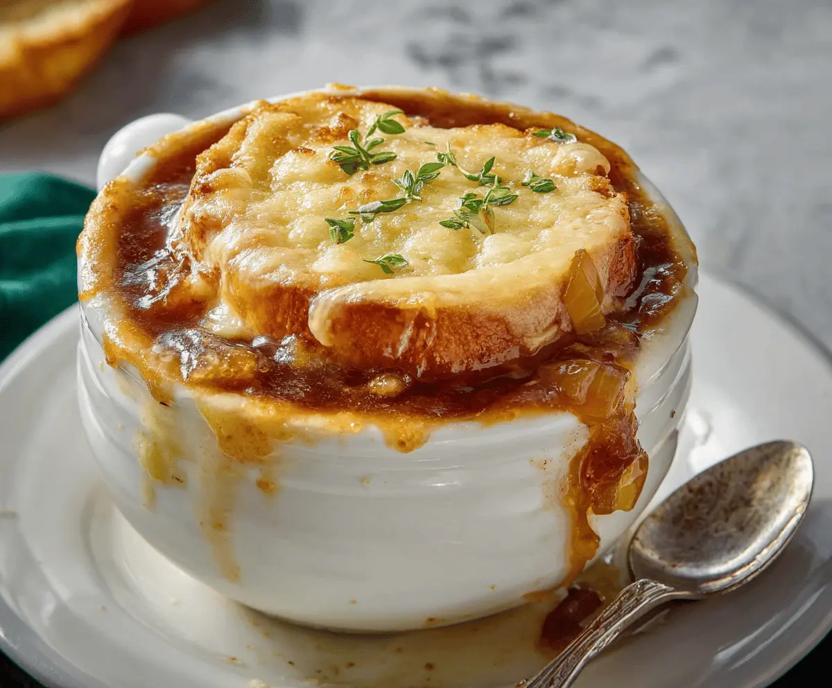 Once out of the oven, garnish with fresh thyme or parsley if you like. Serve immediately and enjoy the warm, cozy goodness of your homemade French Onion Soup!