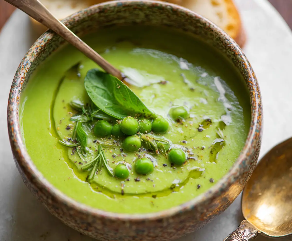 This fresh pea soup is a bright and tasty dish, perfect for springtime! It’s made with sweet peas, a bit of onion, and some tasty herbs, making it both healthy and colorful.