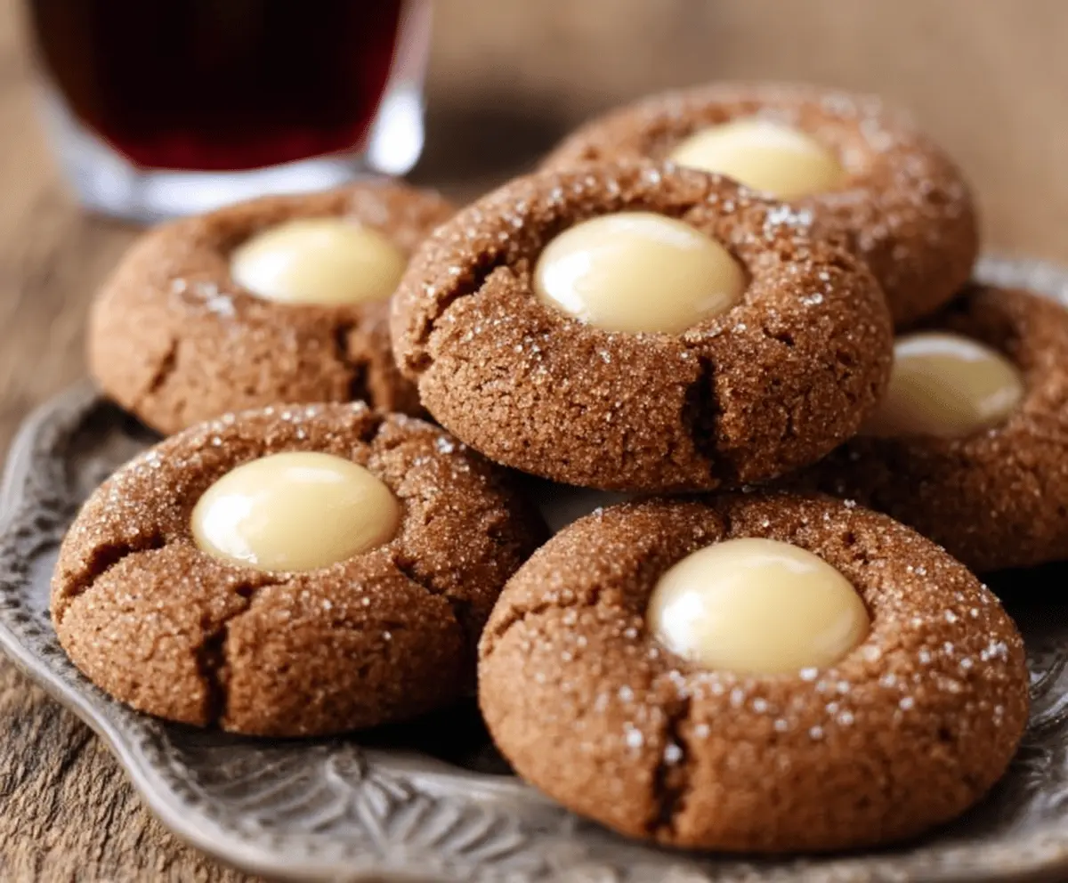 Delicious gingerbread thumbprint cookies with a sprinkle of sugar and a jam-filled center.