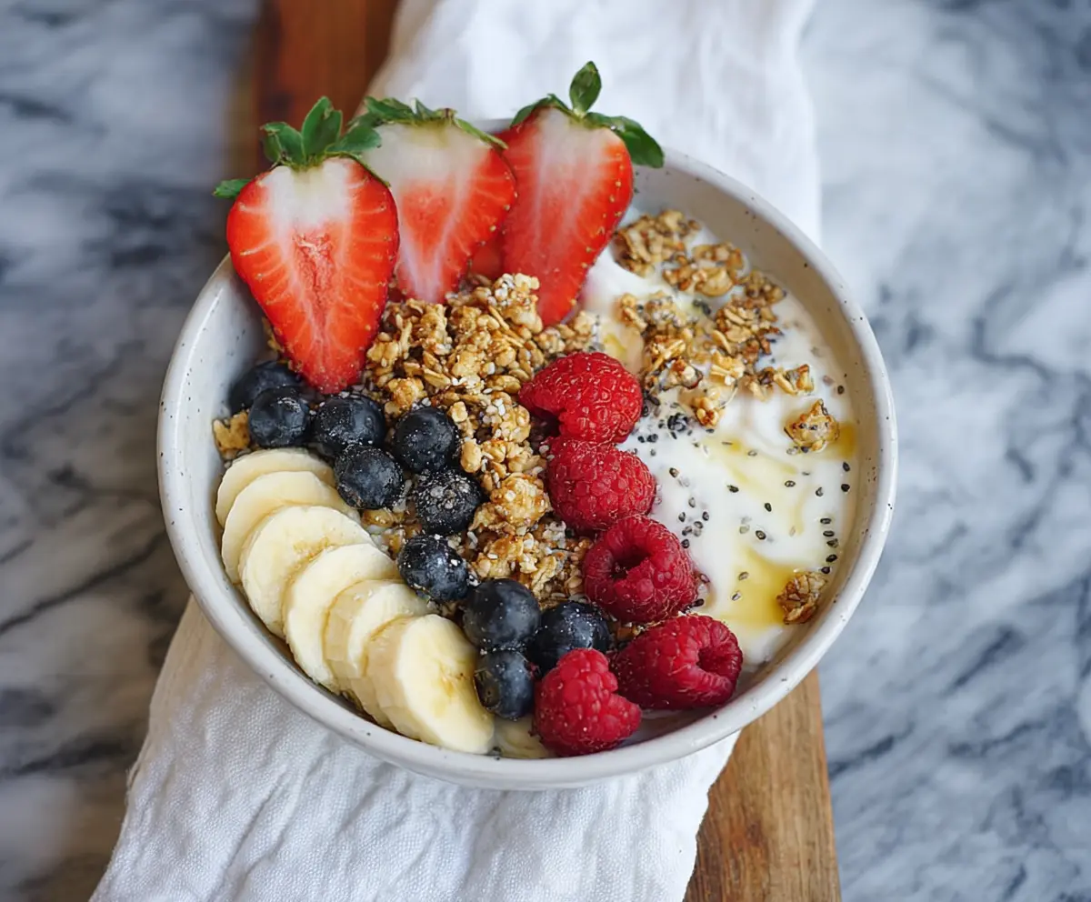 This protein bowl pairs creamy Greek yogurt with antioxidant-rich berries, potassium-packed banana, and hearty granola for a balanced and visually appealing breakfast or snack. Enjoy every spoonful!