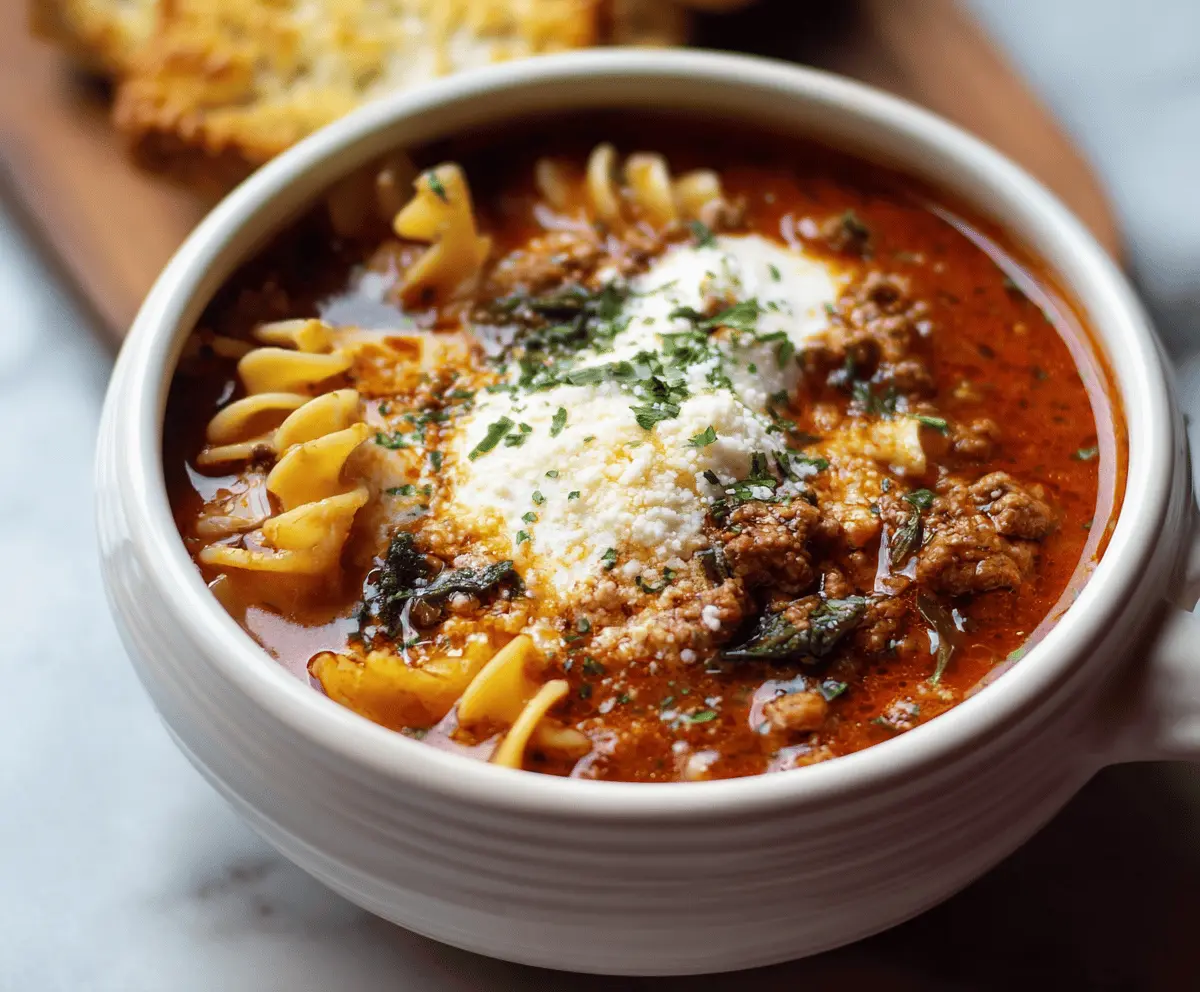 Hearty Ground Beef Lasagna Soup in a bowl with melted cheese, fresh herbs, and pasta noodles, ready to serve