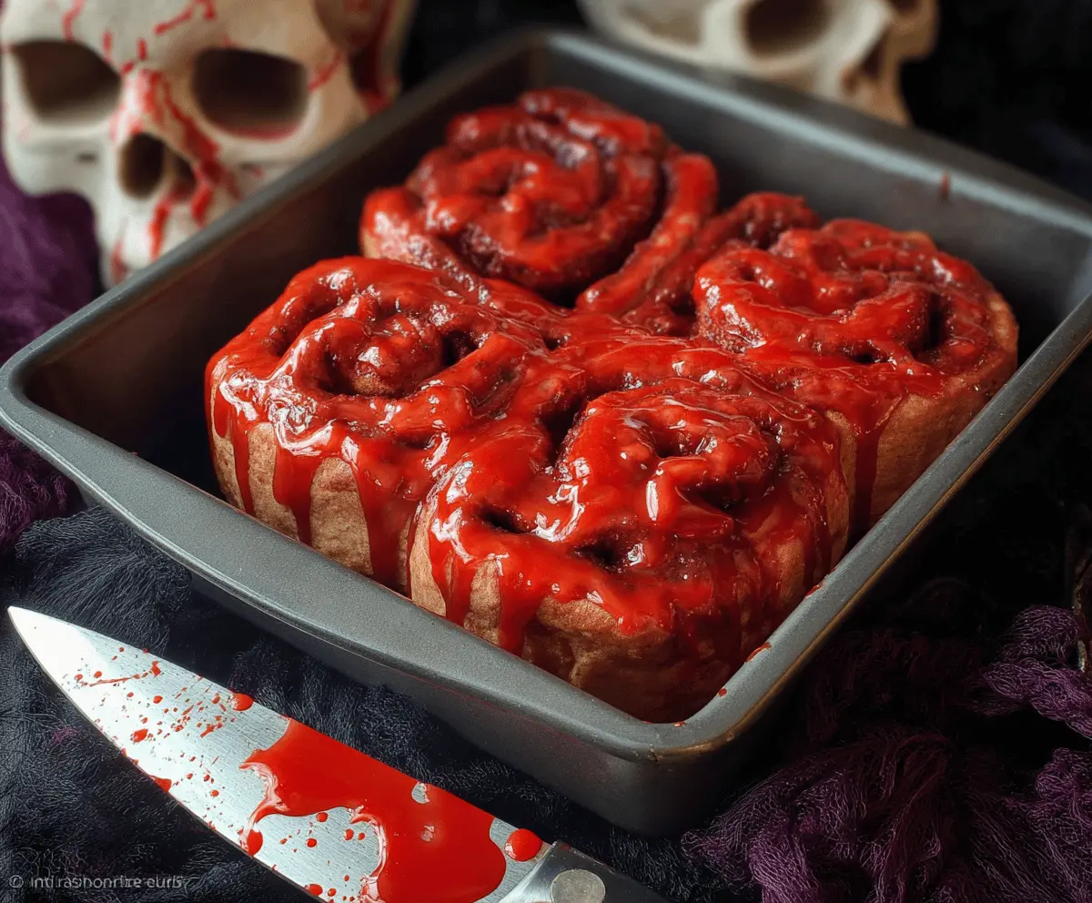 Get ready for some spooky fun with these Halloween Bloody Cinnamon Rolls! Soft and fluffy, these rolls are drizzled with a red icing that looks just like tasty blood. Perfect for a frightful breakfast!