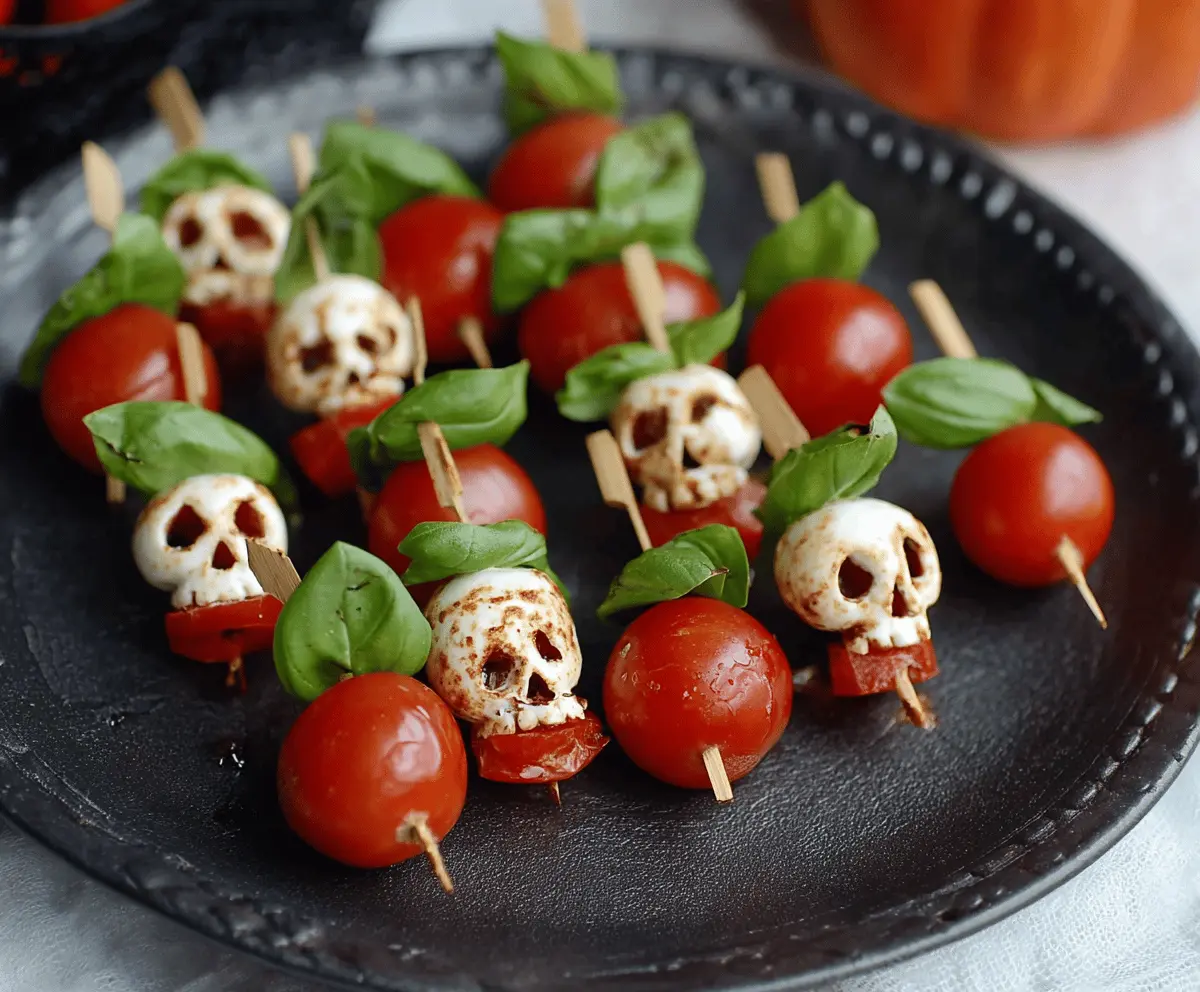 Colorful Halloween Caprese Skewers with cherry tomatoes, fresh mozzarella, basil leaves, and spooky Halloween-themed decorations perfect for festive appetizers