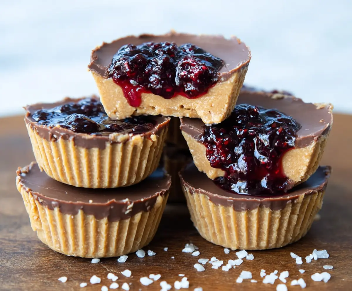 These cups combine creamy peanut butter, sweet yet tart jelly, and rich dark chocolate with a touch of salt for a deliciously balanced healthy snack. Enjoy the goodness!