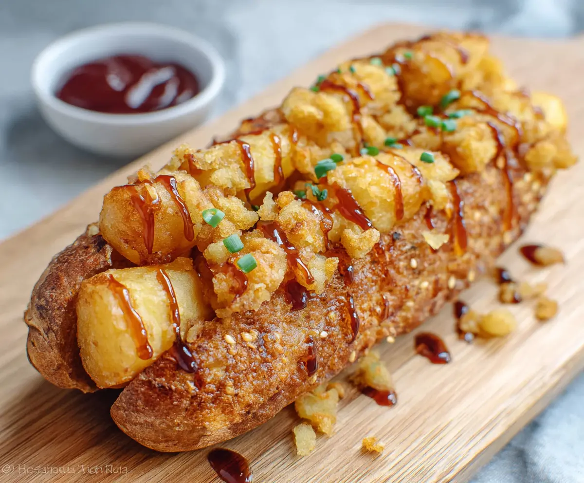 Wrap each hot dog with a layer of the chopped tater tots, making sure to press them firmly so they stick. Next, dip each potato-coated hot dog into the batter, ensuring it’s completely covered. For an extra crunch, you can roll the battered hot dog in panko breadcrumbs.