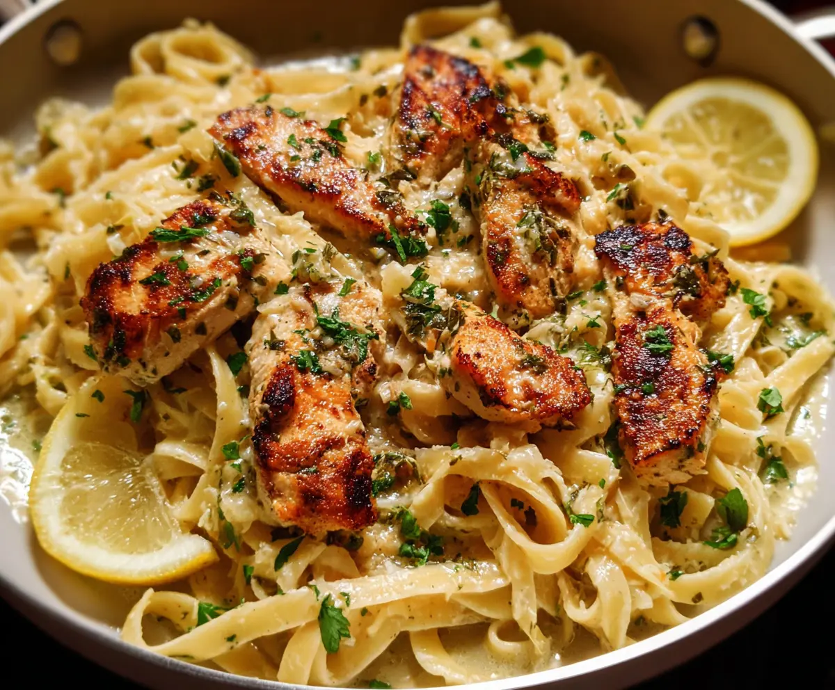 Creamy lemon chicken pasta with fresh herbs and a citrusy flavor, perfect for a quick dinner.