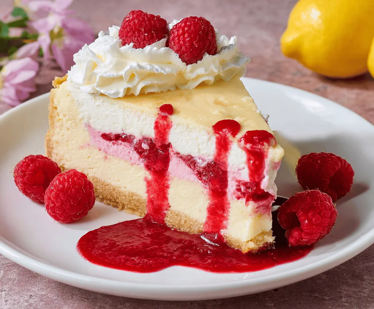 This Lemon Raspberry Cream Cheesecake is a burst of fresh flavors! Creamy cheesecake meets zesty lemon and sweet raspberries, all on a yummy crumbly crust. Perfect for any occasion!