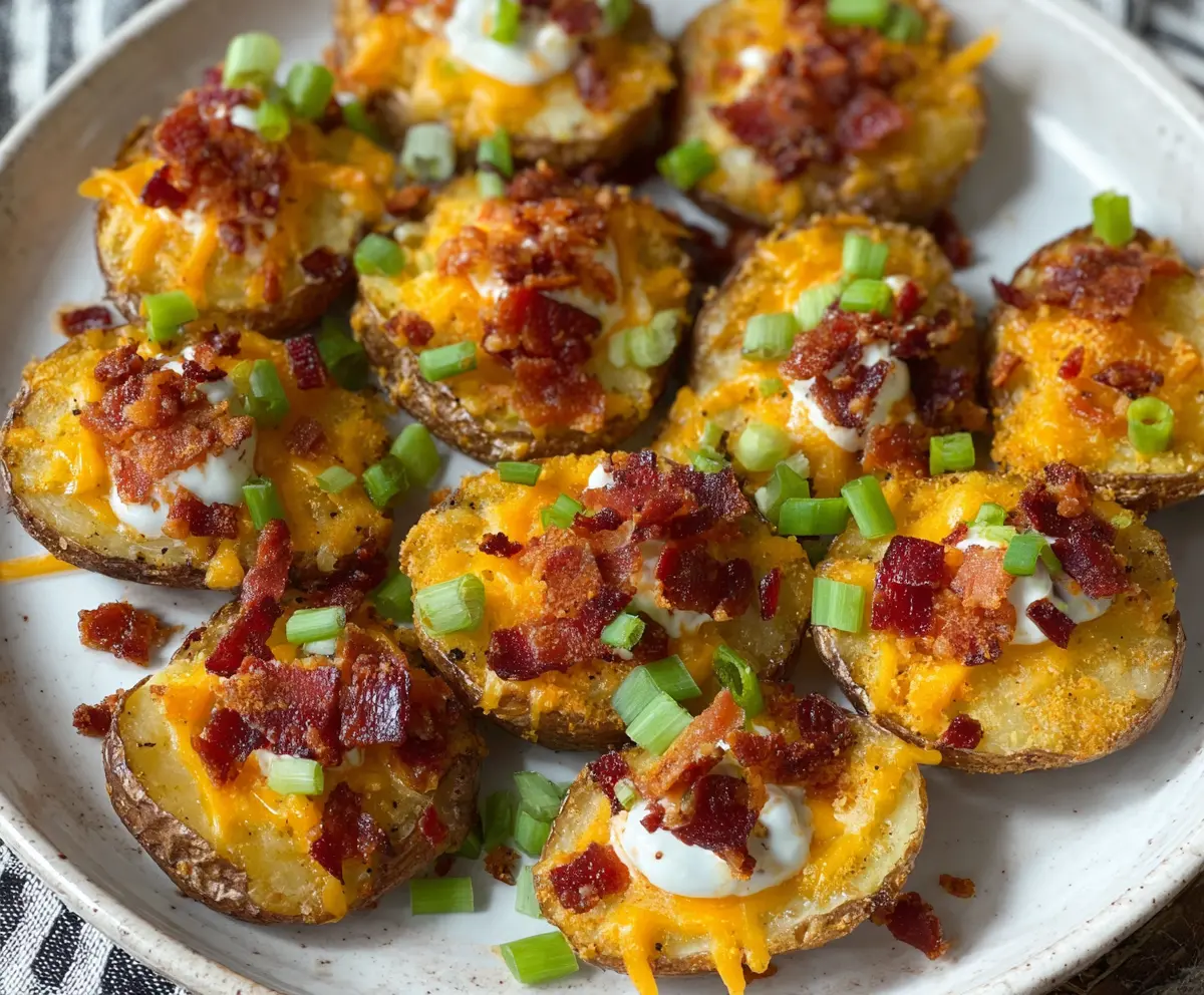 Once the cheese is melted, take them out of the oven. Top each potato bite with a dollop of sour cream, sprinkle with chopped cooked bacon, and finish with chopped chives or green onions for a pop of freshness.