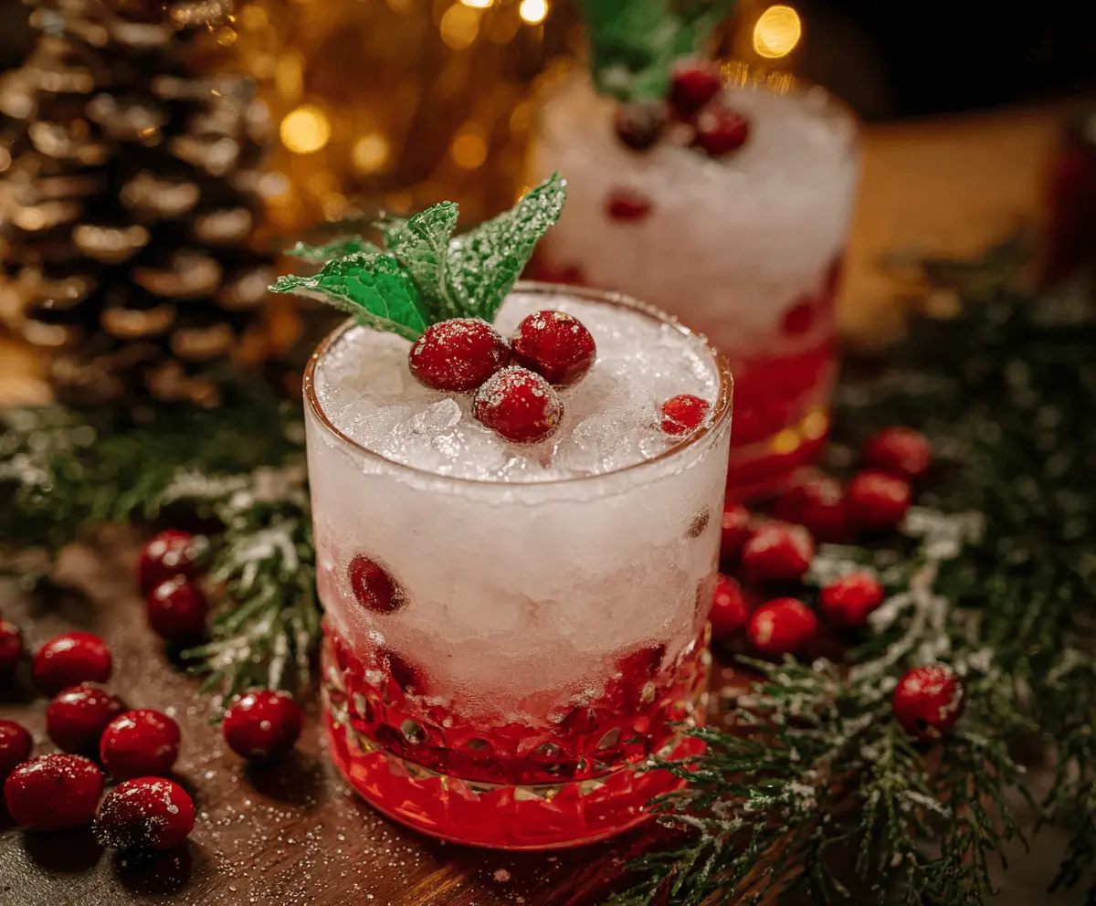 Now comes the fun part! Garnish with fresh cranberries, a sprig of mint, and a small sprig of pine or fir for that festive feel.