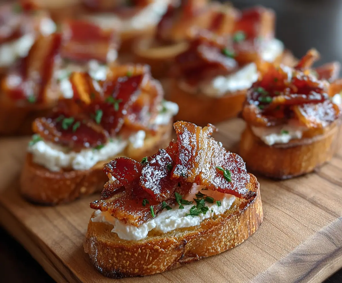 Delicious Million Dollar Bacon Crostini with crispy bread, savory bacon, and fresh toppings.