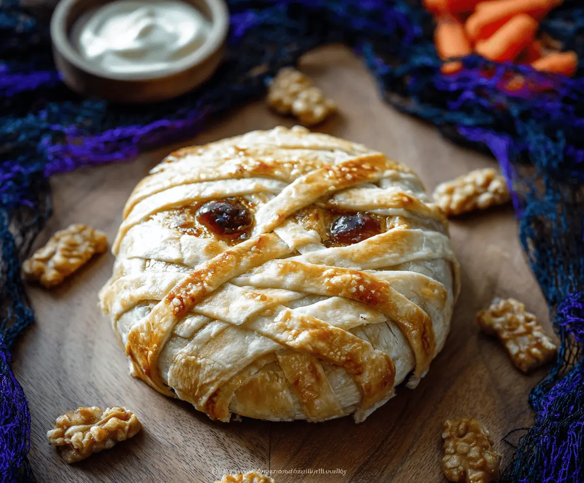 This fun and spooky Mummy Baked Brie is perfect for your Halloween gathering! It features warm, melty brie surrounded by flaky pastry strips, giving it a charming mummy look.