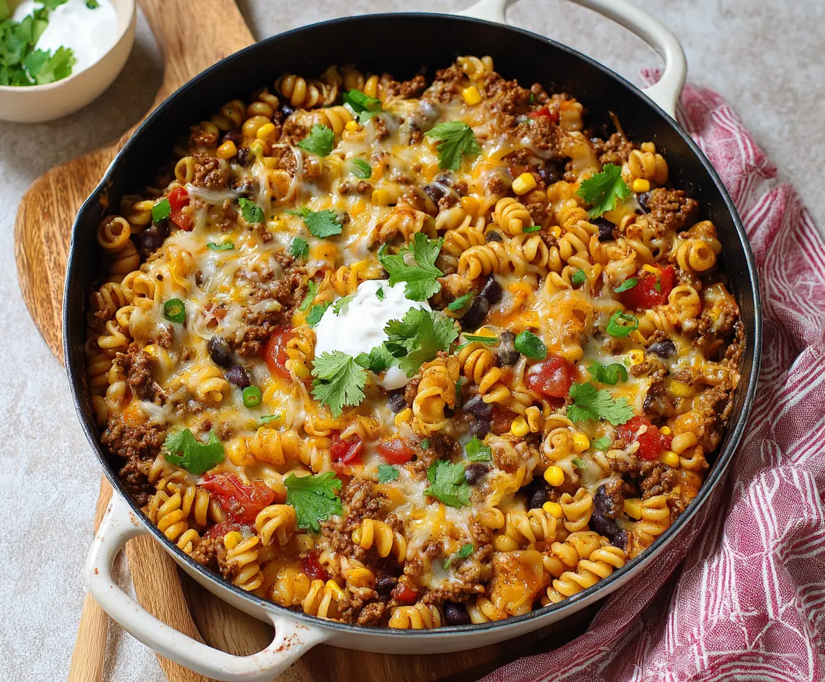 Remove the pot from the heat. Garnish your One Pot Taco Pasta with freshly chopped cilantro. Serve warm and enjoy this easy, flavorful dish!