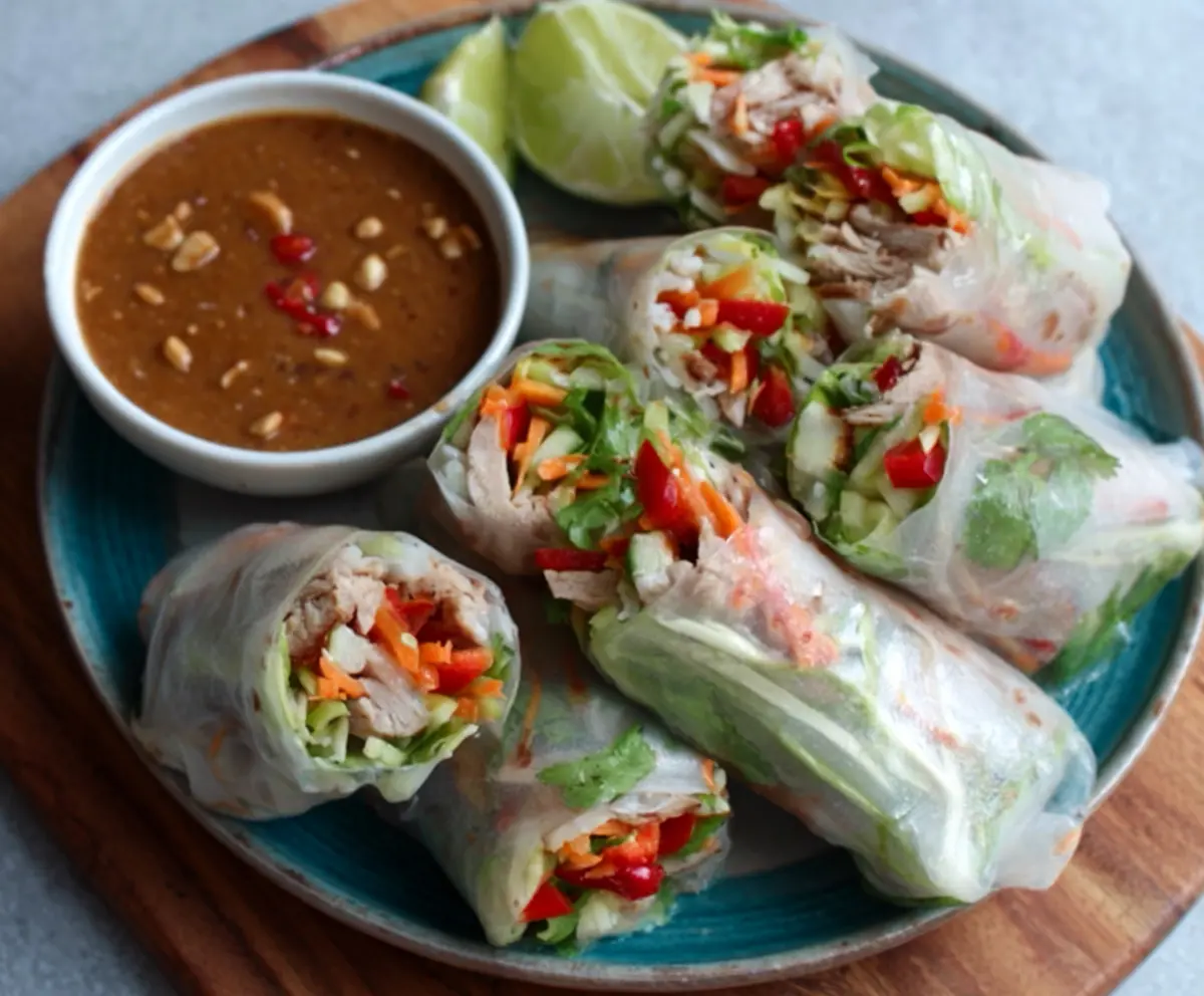 Dig in and savor your fresh, flavorful pork spring rolls paired with the deliciously tangy and creamy peanut lime sauce! Perfect for a light meal or as a snack!