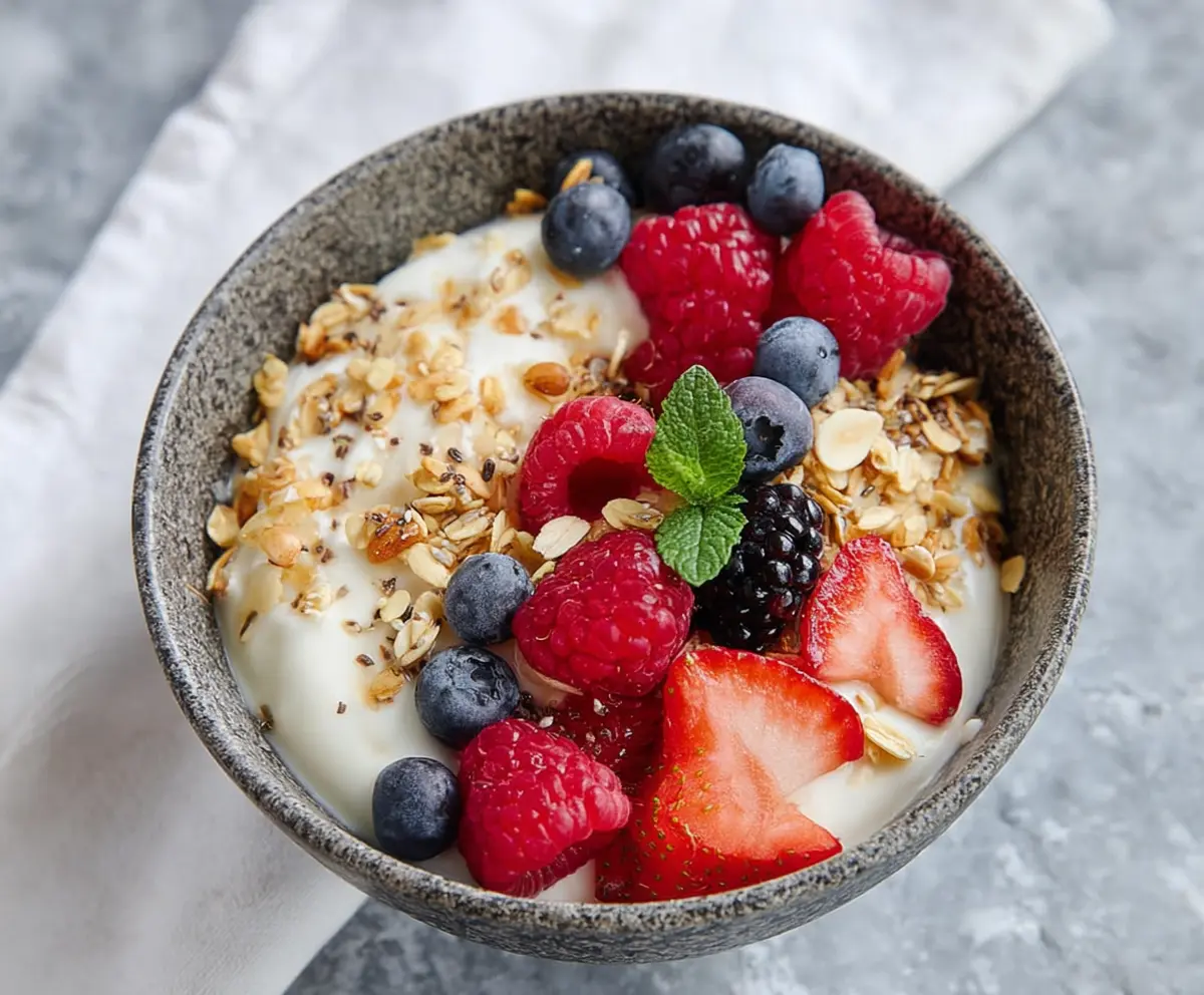 Healthy protein yogurt bowl topped with fresh berries and granola, perfect for a nutritious breakfast.