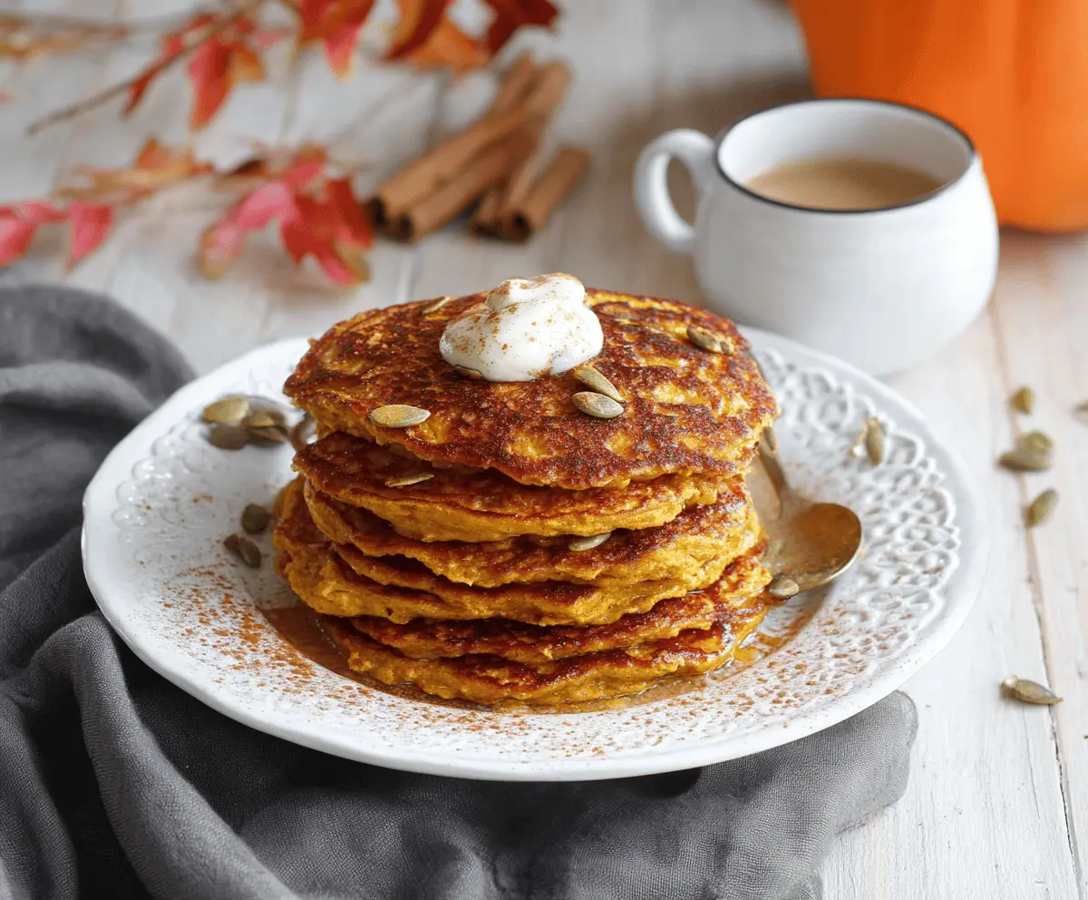 Stack the pancakes on a plate and top generously with whipped cream or Greek yogurt. Sprinkle some pumpkin seeds and a light dusting of cinnamon or pumpkin spice on top. If you have a sweet tooth, drizzle with extra maple syrup before serving. Enjoy your delicious and cozy breakfast!