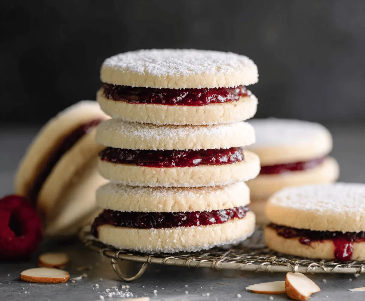 Enjoy these tender, nutty almond cookies with their sweet and tangy raspberry filling for a delightful snack!