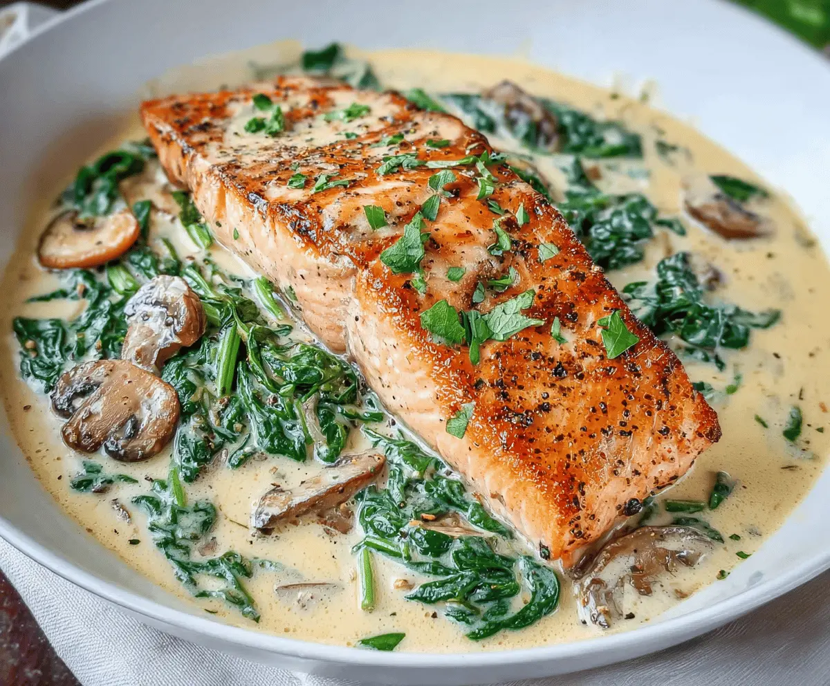 Carefully place the salmon fillets on top of the creamy spinach and mushroom mix, letting them soak in all the delicious flavors.