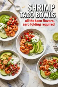 Juicy shrimp, warm rice, crisp cabbage, and cool crema make these shrimp taco bowls feel bright and complete without a lot of kitchen fuss. The shrimp cook fast, but they still carry plenty of smoky chili-lime flavor, and the rest of the bowl gives you all the contrast that keeps each bite interesting. It’s the kind of dinner that looks impressive laid out on the counter and still comes together in the time it takes the rice to heat.