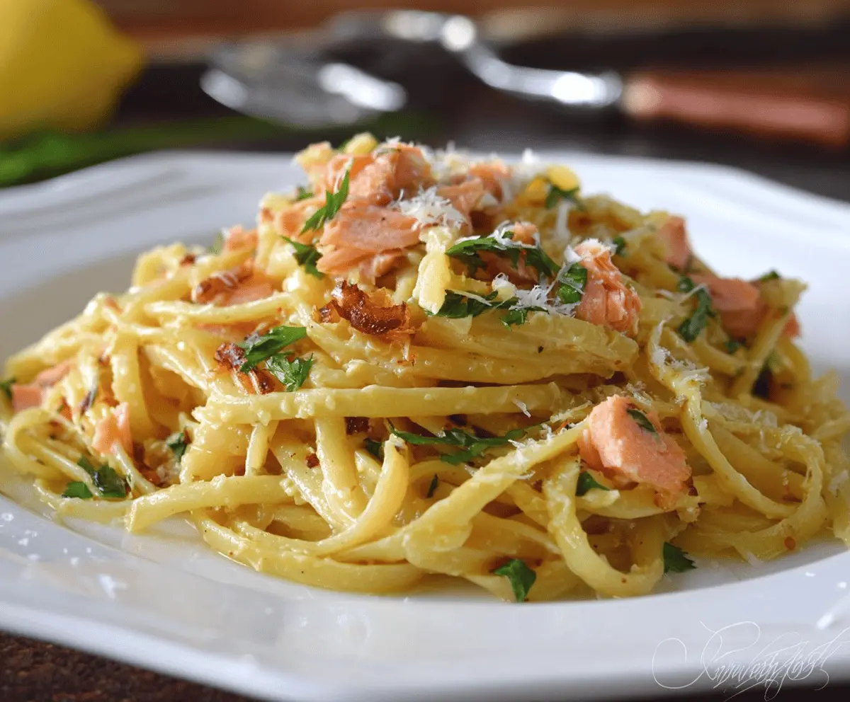 Plate your delicious smoked salmon carbonara immediately. Garnish with extra cheese and parsley if desired. Enjoy this creamy, smoky dish that’s sure to impress your friends and family!