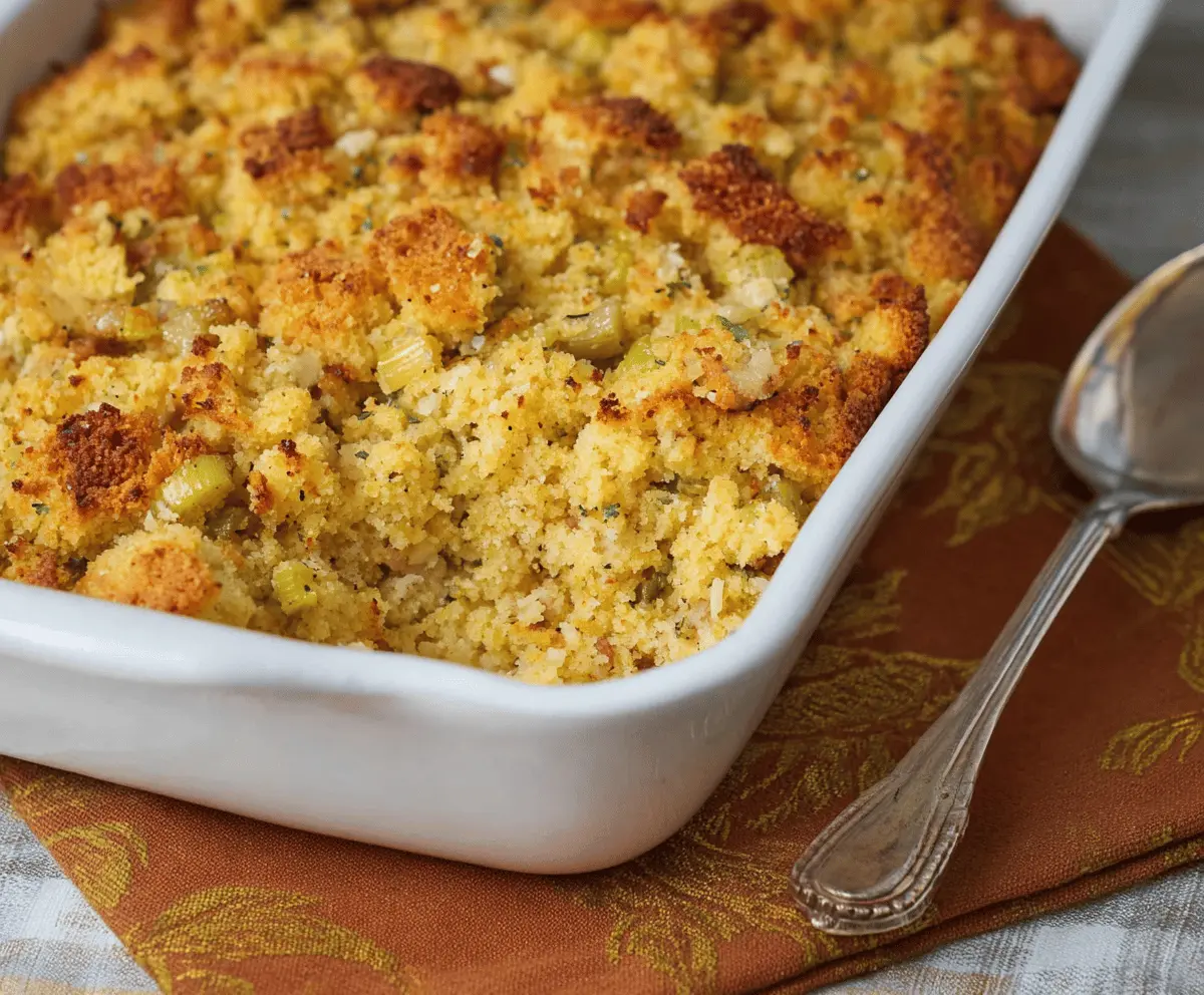 This Southern Cornbread Dressing is a delicious mix of fluffy cornbread, broth, and vegetables. It’s the perfect comfort food, especially during holidays or family gatherings!