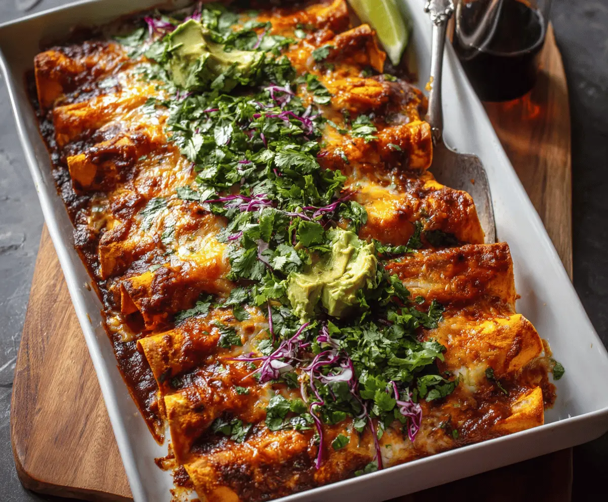 Once done, carefully remove the enchiladas from the oven. Garnish them generously with fresh chopped cilantro. Serve warm with delightful dollops of guacamole or slices of fresh avocado, and a side of sour cream or Mexican crema if you like!